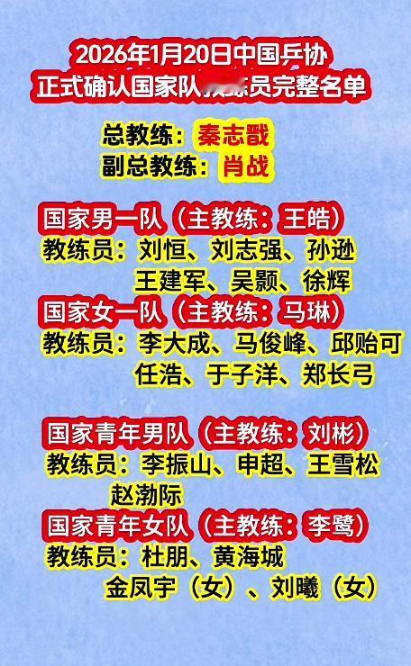 于子洋居然不是带国青队,这个是真没猜到。 具体教练组分组名单没出来,昨天先出来男女队的教练员名单。 这波逐步公布还真是像挤牙膏一样,先来一个总人数,再来一个说了跟没说没差的国家队和青年队教练员名单,下一步该公布具体的主管教练分组名单了吧。[捂脸] 国家男一队和女一队的大部分教练和上周期一样,男队换了两个新面孔:王建军、吴颢, 女队换了三个新面孔:任浩、于子洋、郑长弓,其中任浩之前也有跟赛几次,也不算陌生。 没想到于子洋这么快进国家一队执教,而不是青年队,更没猜到他直接上手的是女一队,于子洋和郑长弓都是左手执拍,具体是哪位主力的主管教练,这个就有点难猜了吧! 这些教练员里,最不用猜的就是志强了吧,大概率还是带大胖。 盲猜一波,这个月底应该能出来具体的主管教练分组名单了吧?[灵光一闪] (图片来源于网络)