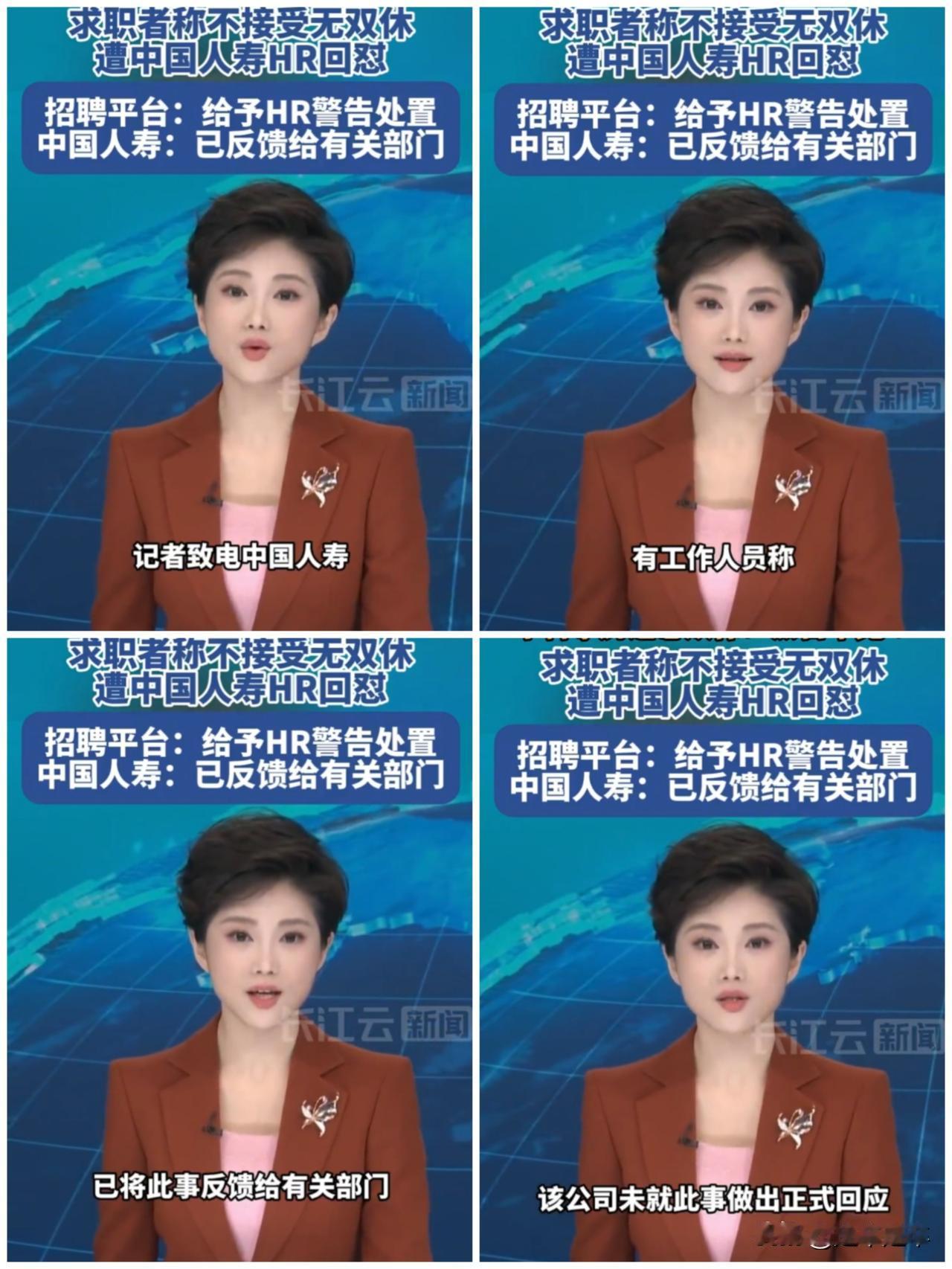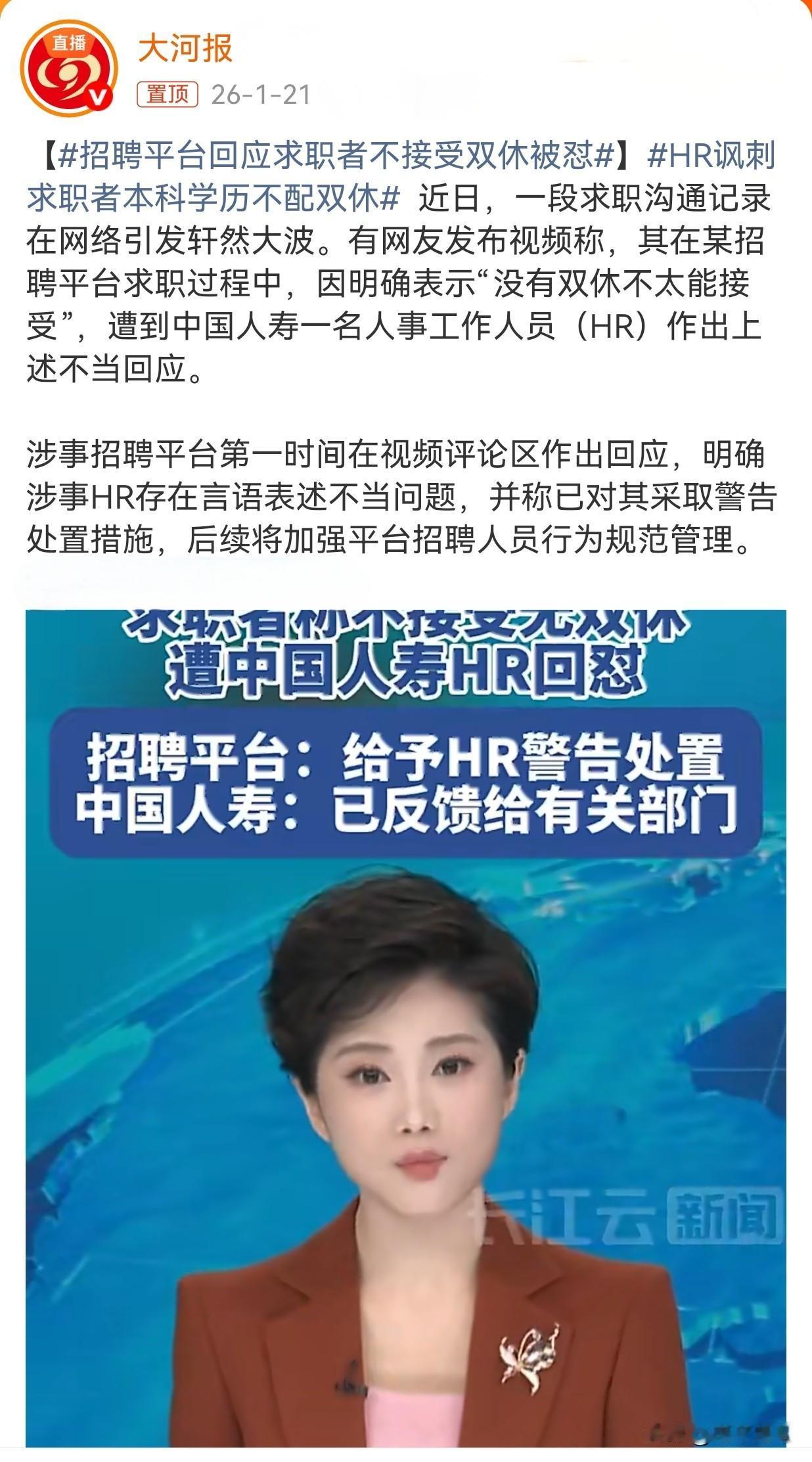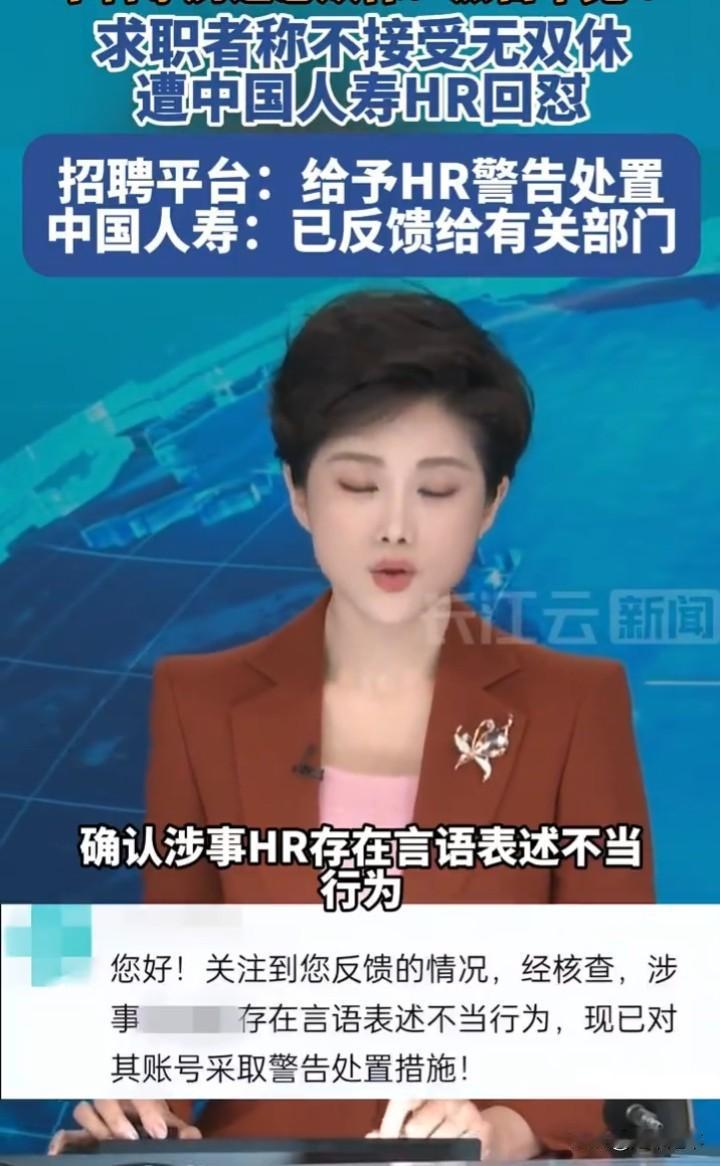 中国人寿请问这位 HR 还在贵司任职吗?😡 26年1月18日,一名求职者在招聘平台沟通中国人寿岗位时,因表示“无法接受无双休”,遭到该公司HR凯女士的讽刺性回复:“你一个本科学历的还想要双休?在黑名单里见。 招聘平台已认定了这个HR言语表达不当,采取了警告措施,而人寿至今日未有官方的回复。 身为一名HR必须是要对《劳动法》有深入的了解的,而《劳动法》赋予劳动者双休是最基本的权力无论是什么学历什么工种(周工时不超过44小时)。这位HR竟然会不知道?你们人寿招聘他的时候没有考核他的法律方面常识吗? 想问一下此位HR说的言论是代表他自己瞧不起本科学历的人员,还是代表人寿想压榨劳动力,却拿学历当挡箭牌?一边是求职者对工作的合理诉求,一边是企业主管人事的专员漠视法律、践踏权益的傲慢。这种言论寒的是求职者的心,毁的是企业的口碑。HR作为企业形象代表,其言论反映你们人寿在管理上漏洞。 企业要良好的发展必定是离不开优秀的人员,但是从主管到保洁人员对人待物都要有一颗善良的心。更何况你们还是从事保险这一带有社会公益性质的行业。“本科不配双休”的傲慢言论被企业默许,求职者是会用脚来投票的。企业若想留住人,靠的该是尊重与保障,而非这种傲慢的歧视。 中国人寿