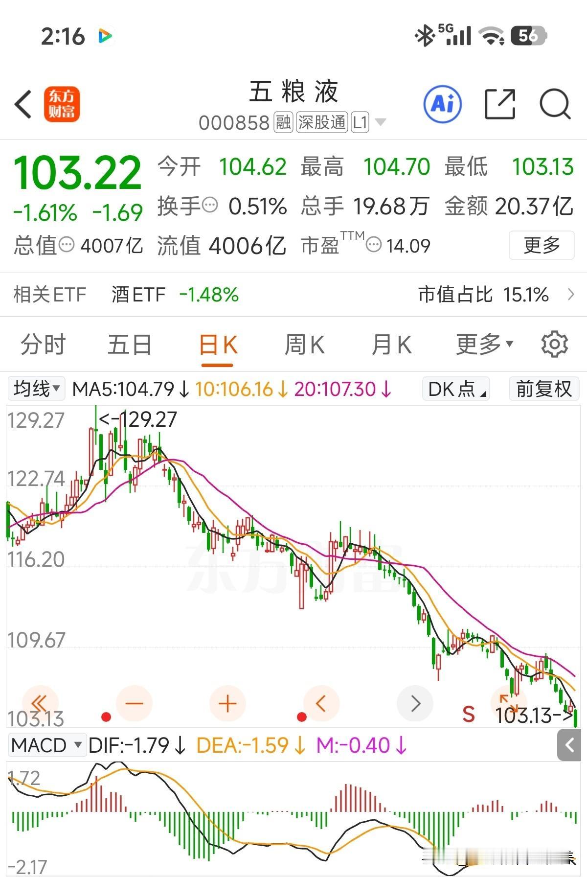 这走势跟大秦铁路有得一拼!即便手上持有不多,这一波砸下来,账户也损失不小[流泪]! 抛开行业问题,五粮液市值管理实在值得吐槽,账面大笔资金躺着拿低息,隔壁茅大哥已经连续两轮回购注销了,五粮液没任何动作! 最近一轮大股东增持,也是按最低金额草草完成,业绩上三季度直接拉胯! 吐槽归吐槽,手上这点仓位不增不减,继续收息,五粮液的底子仍在,个人账户内现金仓位也在!100元以下价位再考虑是否值得操作!