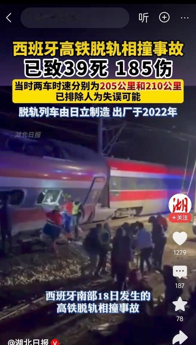 西班牙高铁脱轨事故!欧洲媒体和国内自媒体为什么没有人去骂机车制造商呢?西班牙官方公告声称:路是新路,车是新车,人为事故也排除了!那不就剩下车的问题了吗?我们太幸运幸亏西班牙高铁是日本日立生产的!要不然一群人就会出来“反思”我们各种问题。 2026年1月18日晚,西班牙南部科尔多瓦省阿达穆斯附近发生一起严重高铁事故。一列从马拉加开往马德里的Iryo高铁列车脱轨,后部车厢侵入对向线路,与对向一列Renfe Alvia列车相撞。事故造成42人死亡,超过百人受伤。西班牙交通部和铁路事故调查委员会CIAF随后公布初步信息:事发轨道是2025年5月刚完成翻新的新线,列车是2022年交付的日立ETR 1000系列(西班牙称S109),服役不到四年,最近一次大修在2026年1月15日完成,人为操作失误已被排除。 官方表态很明确,轨道新、车新、司机没问题。那逻辑上讲,锅到底甩给谁?欧洲主流媒体的报道基本都集中在轨道可能存在隐蔽缺陷、鱼尾板老化、焊接裂纹提前出现,或者轨道检测设备漏检这些环节上。西班牙交通大臣奥斯卡·普恩特公开说“轨道有多处损坏,但现在分不清是原因还是结果”,首相桑切斯也只强调“绝对透明、找出真相”。几乎没人把矛头直接指向日立公司本身。 这就很有意思了。如果同样的事故发生在咱们这儿,列车是国产CR系列,网上大概率会炸锅。各种大V、意见领袖会迅速列出“转向架问题”“焊缝疲劳”“空气弹簧失效”“牵引系统响应迟钝”一堆专业名词,然后开始长篇反思“管理粗放”“标准执行走样”“国产化急功近利”“安全文化缺失”。评论区还会出现“又出事了”“什么时候能真正赶超日本”“反思吧”“别总吹嘘世界领先”这种熟悉的节奏。哪怕最后调查结论是轨道断裂或外部因素,初期舆论也肯定先把车辆厂和主机厂喷一轮再说。 为什么西班牙这事儿就没人往制造商身上使劲怼?一个原因是日立在欧洲高铁圈的口碑确实稳。ETR 1000系列在意大利运行多年,事故率低,德国、荷兰也引进过类似技术,整体可靠性数据摆在那儿。另一个原因是欧洲媒体和公众对高铁事故的责任归因习惯不同。他们更倾向于把锅甩给基础设施运营商Adif(西班牙铁路基础设施管理局)和线路维护方,而不是车辆供应商。除非有明确证据证明车辆设计或制造有硬伤,否则舆论不会轻易下结论。国内网络环境不一样,一旦出大事,情绪先上来,找个显眼的靶子开火最解气,而车辆作为“看得见摸得着”的产品天然容易成为靶子。 说白了,这里面有双标成分,也有现实差异。西班牙是老牌发达国家,高铁网络密度高但很多线路年龄大,轨道问题更容易被当成主因。咱们高铁里程世界第一,但公众对国产设备的心理预期是“必须完美”,容错空间小,一出事就放大到国家层面反思。日立这回算是“躺赢”了,换成别的品牌,估计欧洲媒体也会多问几句“车辆有没有责任”。但因为它是日立,技术光环加持,加上事故初期证据都指向轨道,舆论就自然绕过去了。至少目前看,日立躲过了一劫,而假如是别的车,估计早就被围攻了。