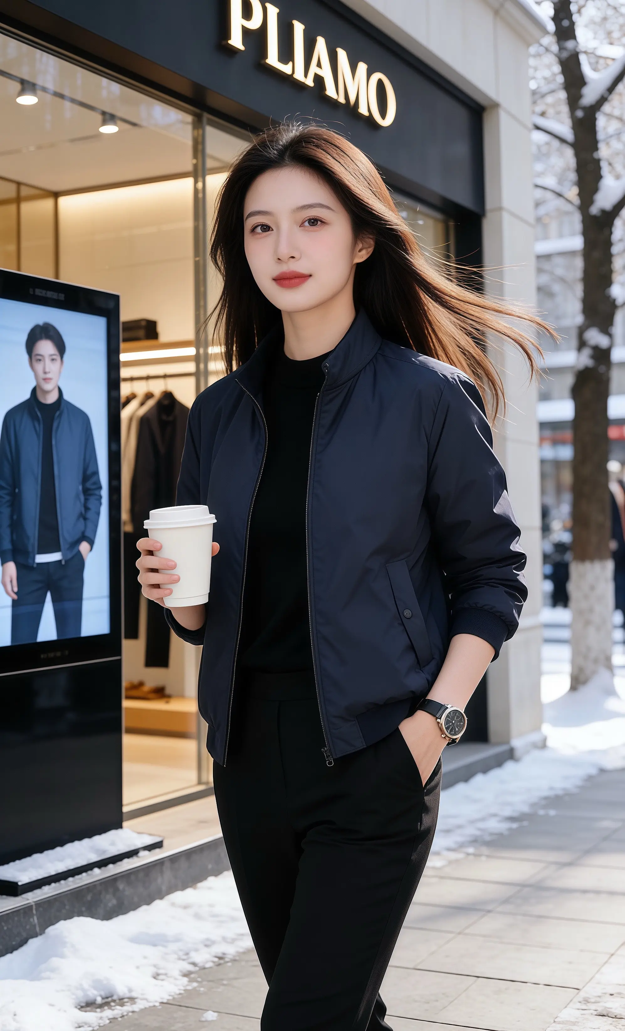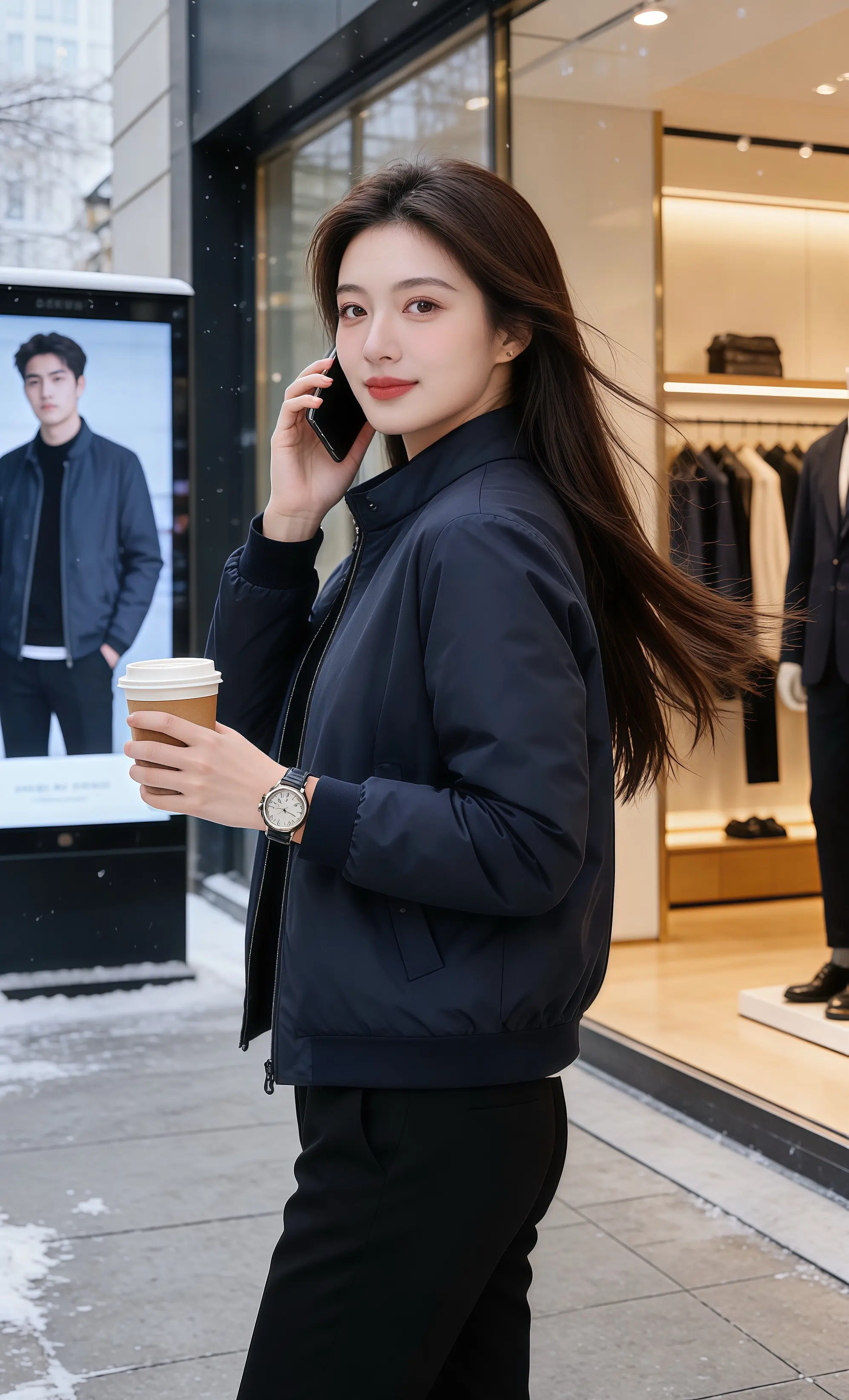 薄雪刚融的晴日,皓明在咖啡店的落地窗边看见许妍。她的藏青短外套面料挺括,立领与拉链设计添了利落感,内搭黑色高领衫衬得色调沉稳,黑裤的版型衬得身形舒展,手腕的腕表与这身搭配相衬得宜。