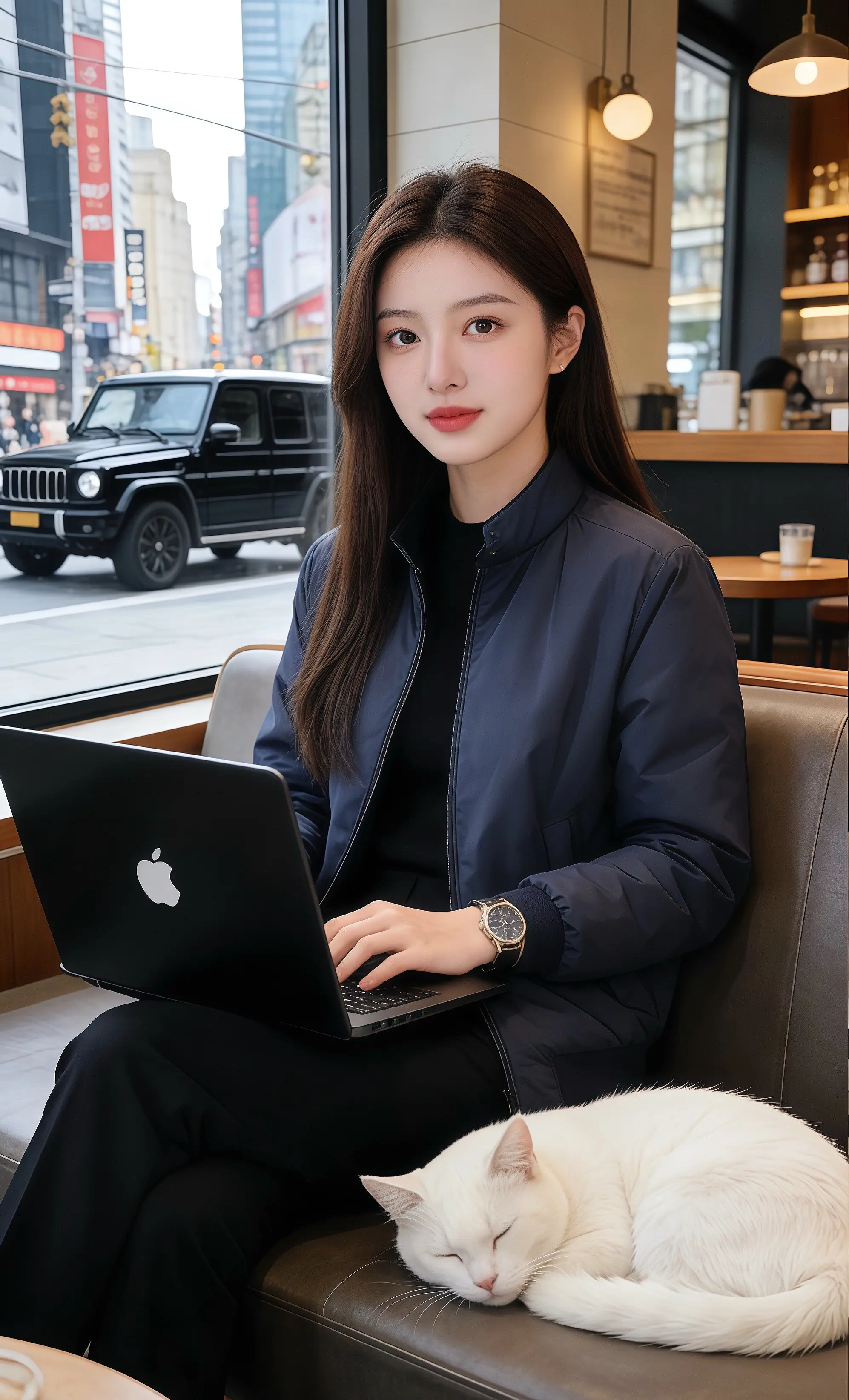 她低头敲着笔记本电脑时,外套衣摆轻垂,膝头蜷着的白猫更添了几分软意,竟比海报里的展示多了鲜活的温柔。“这藏青外套的搭配,你穿得比海报合衬多了,店里的款式都衬不出这份雅致的美感。”皓明走近开口,许妍抬眸笑时,眼尾的弧度撞得他心尖发暖。