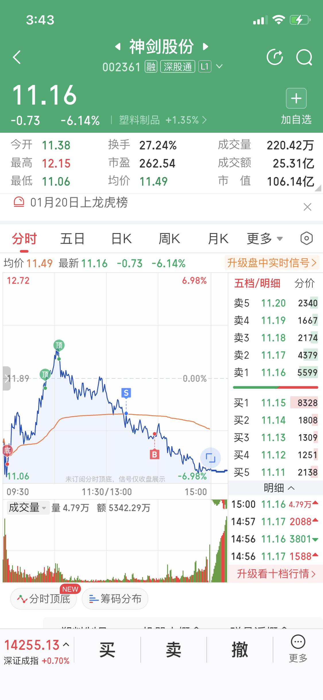 1月21日这一天,神剑股份的朱莉可把我给忽悠惨了。当时我一看,嘿,商业航天板块好像要修复反弹了,分时图上股价蹭蹭往上涨,我这小心脏就开始扑通扑通跳,还以为抓到了赚钱的机会。 可后来仔细一瞧,不对劲啊!股价涨了,量能却跟不上,这不是典型的诱多吗?主力这是在玩虚的,吸引像我这样的小散上钩呢。现在想来真是后悔,当时就该多留个心眼。今天必须得果断点,该走就得走,可不能再被它给套住了,不然又得吃大亏。