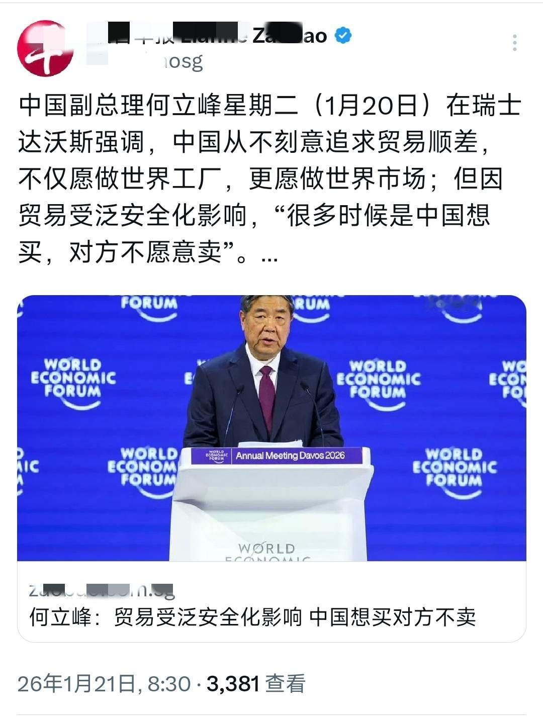 当我们成为人类有史以来第一个贸易顺差破万亿美元的国家时,他们无能为力地酸了。 三哥坡的某报更是酸酸地说:“依赖出口不可持续”。其实这二三十年,他们每年都在说不可持续,要崩了。年年喊,年年预测,年年错。 是我们要成为破万亿顺差的贸易大国吗?不是!就像何副总理说的:我们从不刻意追求贸易顺差,不仅愿做世界工厂,更愿做世界市场;但因贸易受泛安全化影响,“很多时候是中国想买,对方不愿意卖”。恰恰就是他们不愿意卖我们想要的产品,才造成了目前的现状。 我们总不能买一些自家有的,对方质量价格却还不如我们自家的东西来放仓库?我们更不可能买一些收割智商税的玩意,来侮辱自己的智商。 作为全球最大的单一市场,今年你们不卖,明年不卖,一旦我们依靠国内市场需求及自身强大的科研能力生产出来,那你们就没得卖了。这时候想回头来找我们,那就来不及了。 而作为全球第二大的经济体,2025年我们按计划实现5%的经济目标,成为主要经济体里面发展最好的。相比下,欧洲那几乎可以忽略不计的增长率他们一点都没唱衰过,美国只有中国一半的增长率,他们更是吹捧上天了。 其实不是我们不可持续,而是一直以来他们都在看衰我们。似乎我们越来越好,他们越来越气急败坏。