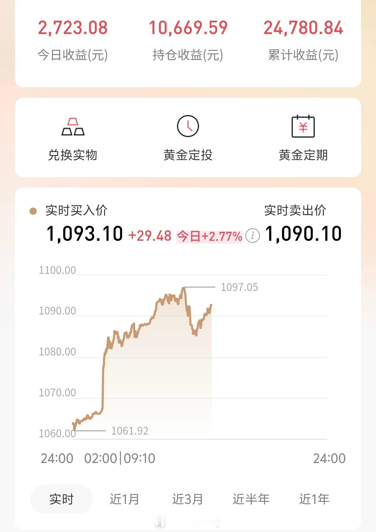 感觉金价要冲击1100了 赶紧狠狠补仓了一波,等到了1100我就卖。情绪到了,该冲还是得冲的,能不能稳住两说。这波赚着,股票赔着,四舍五入啥也没干,投资真是风险太大了。
