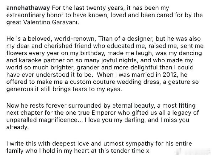 安妮海瑟薇悼念华伦天奴安妮海瑟薇的婚纱是华伦天奴定制的 21日,安妮·海瑟薇发文悼念华伦天奴,字里行间满是感恩与不舍。她提及自己2012年的婚礼婚纱由华伦天奴量身定制,这份心意让她铭记多年,每每想起都热泪盈眶。过去二十年,两人亦多次携手塑造红毯经典。