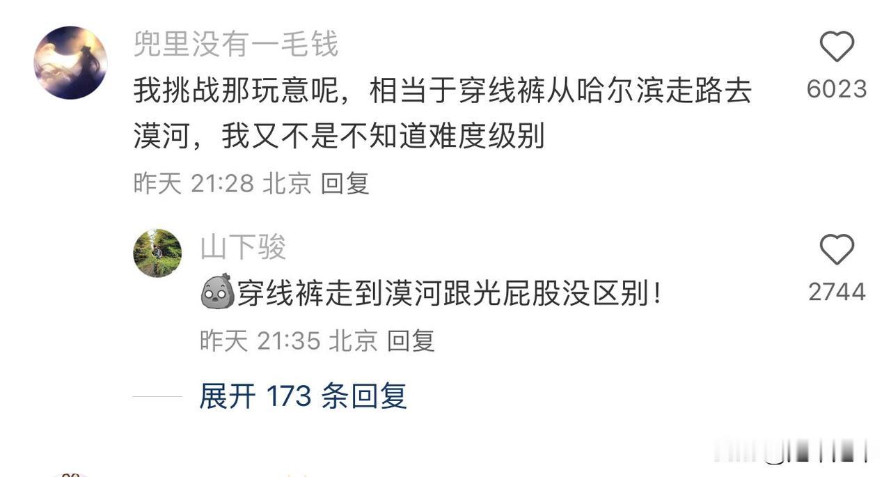 今天(1月21号)看见了一个挺有意思的帖子,和大家分享一下。就是有朋友们在发帖提问?为何东北人从来不去挑战一下,鳌太线! 众多网友回复这个问题的关键原因就是,“冷就是冷”的东北实用主义哲学。东北人长期生活在严寒环境中,深刻理解低温环境的致命性。“东北人相信冷就是冷,喝酒吃辣这些‘魔法’都没用”。这种认知让他们对鳌太线零下40℃的极寒环境抱有天然警惕,而非盲目挑战。 的确如此东北的冷可通过暖气、厚装备缓冲,而鳌太线是在严寒天气里持续暴露的“死亡组合”,70公里无人区、8级强风、瞬息暴雪的地狱模式。难怪有东北的网友直言“东北人要挨冻用费那牛劲?家门口就冻立正了”,道破生存体验与极限挑战的界限。没错东北人只是生活儿在冷的地方儿,但不是傻大胆儿。18年至今官方严禁穿越,东北户外爱好者更倾向选择合法路线。面对“为何不挑战”的提问,东北网友用饺子来比喻道“我妈包的饺子放窗外一小时冻成石头,你叫我去挑战鳌太?”这种自嘲方式是风险教育的民间表达。连日常食物都能秒变“凶器”,何况去冒险去闯生死禁区。 普通人要对自己的能力和环境有清醒认知,别被“说走就走的旅行”和“挑战极限”冲昏头。安全永远比“征服”更重要。 “我们征服不了任何一座山,只是山放过了我们”。探险的意义从不是挑战禁忌、漠视规则,真正的户外精神,应是对自然的敬畏、对生命的珍视。鳌太线禁令 冬季鳌太线