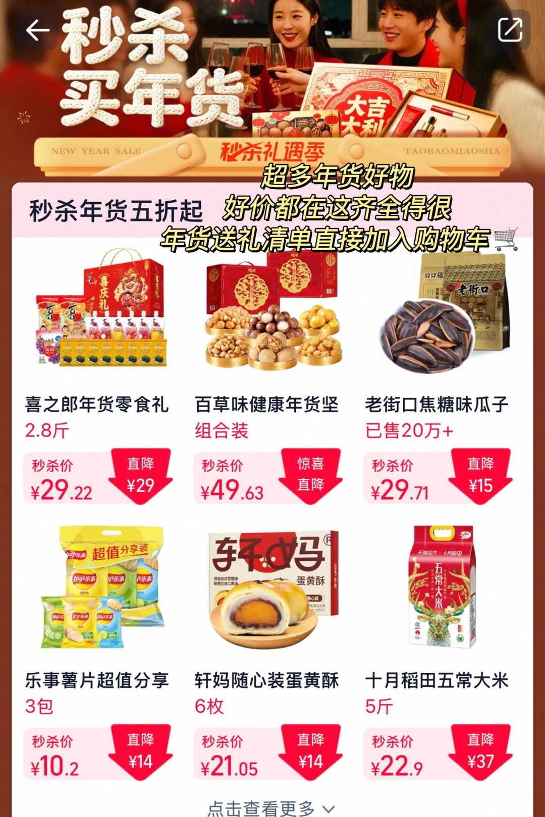 00后开始主导家里的年货清单了 就这么说,有的是力气和手段拿下今年大家都满意的年货 这不刚出手,就被淘宝秒杀的力度迷住了 直接入手了大部分年货 乐事薯片分享装🍟: 性价比绝了!独立小包装不浪费,多口味配齐,不管招待客人还是追剧都合适,关键秒杀价比超市便宜一半还多。 喜之郎年货礼盒🎁: 也必须冲!包装喜庆,里面果冻、海苔一站式配齐,大人小孩都爱吃,走亲访友拎着有面,秒杀价入手完全不心疼。 百草味坚果礼盒🌰 : 秒杀价闭眼入!大颗粒坚果果肉饱满,多种品类搭配,健康又解馋,过年招待客人、走亲访友里子面子都有了,比实体店省几十块。 全是实实在在的好货,没有狠货,淘宝秒杀省钱攻略奉上,手把手教你省大钱👇 ✅ 打开淘宝首页,点击【淘宝秒杀】进入专属频道 ✅ 先领频道红包🧧 无门槛直接用,这不白菜价吗哪能不冲 ✅ 搜索【秒杀疯抢年货】,爆款直接陈列,不用找来找去 ✅ 限时疯抢区闭眼冲,五折起就能拿下,手快还有1元大牌好物 年货还没囤的宝子赶紧冲,晚了热门口味可就被抢空啦!