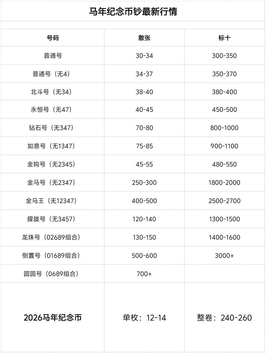 2026马年币钞最新行情已经整理出来,市价略微向上涨幅,今天就可以兑换马钞了,你手里的号码是什么样的呢?评论区晒晒吧!