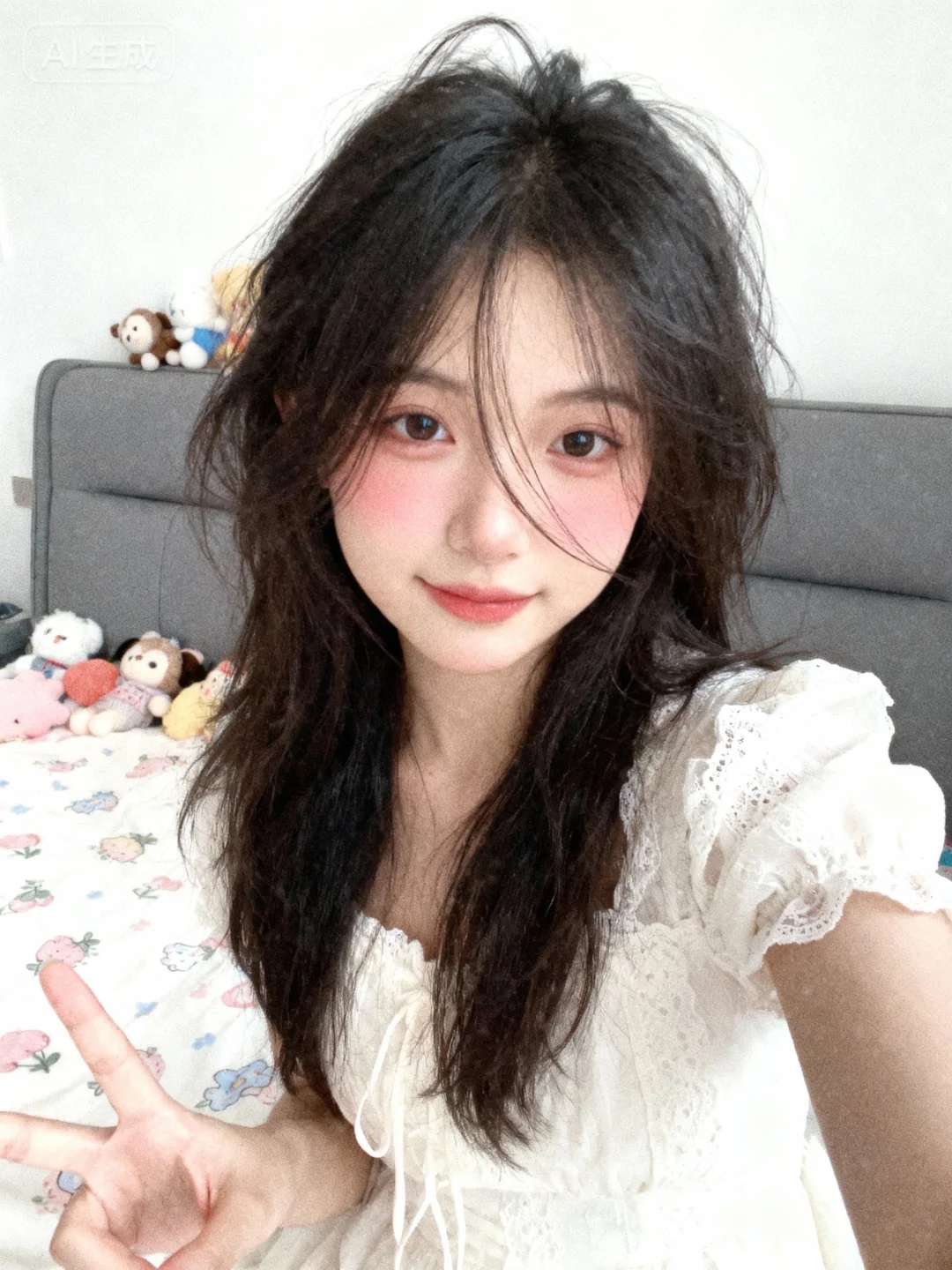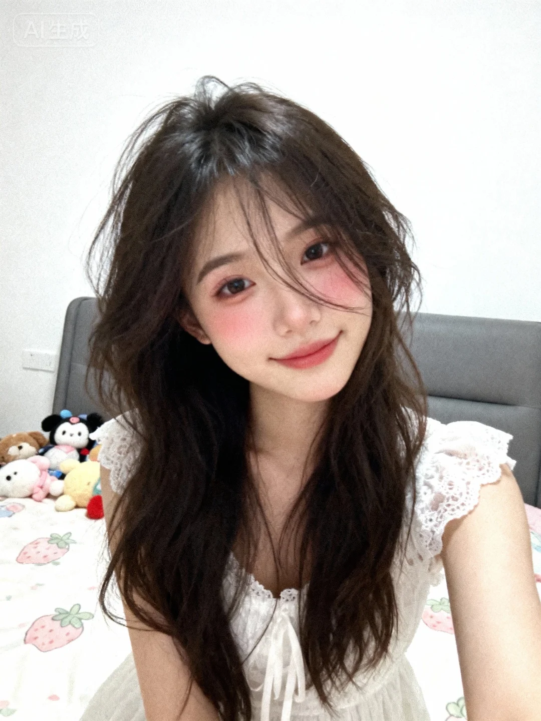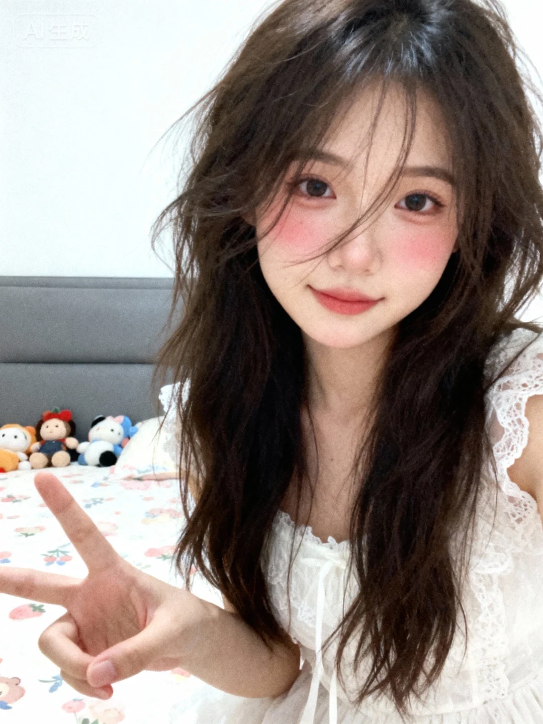 高清网感自拍,女生对着镜头摆pose,表情俏皮,可爱,甜美,碎发轻拂脸颊,头发长发蓬松,稍显凌乱,妆容清透自然,眼尾带点微醺腮红,背景是简约的卧室的床上,可爱床单,白墙,灰色床头,床头散落着玩偶,整体画面带点模糊颗粒感,穿的蕾丝白色连衣裙。 甜妹风格。