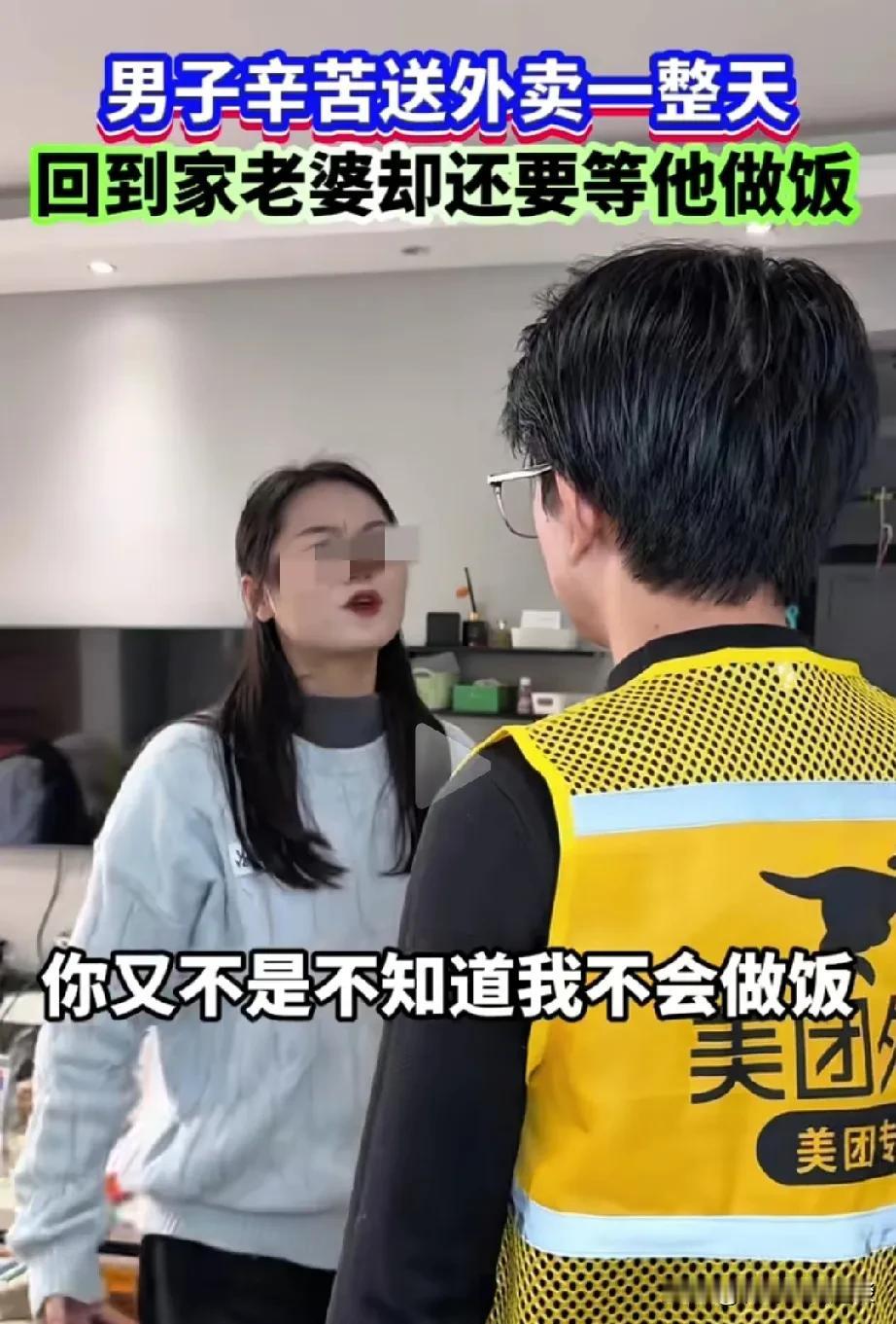 这样的老婆要她干嘛,离婚算了。男子出去辛苦送外卖一天,回到家里,他老婆还在刷手机,不但没有给他做饭,连她自己还要等着男人回家做饭给他吃。 男人一进门,他老婆就说,你怎么才回来呀?我都快饿晕了,快点给我做饭。男人说你不上班,连自己的饭都不做,你天天在家干嘛?女人说她不会做饭。 女人说,当时相亲的时候,你不是说你养我吗?家务不让我干。男人此时此刻非常的无语,这哪是娶个老婆,这是娶回来一个活祖宗,这一辈子刚开始,啥时候是个头啊?