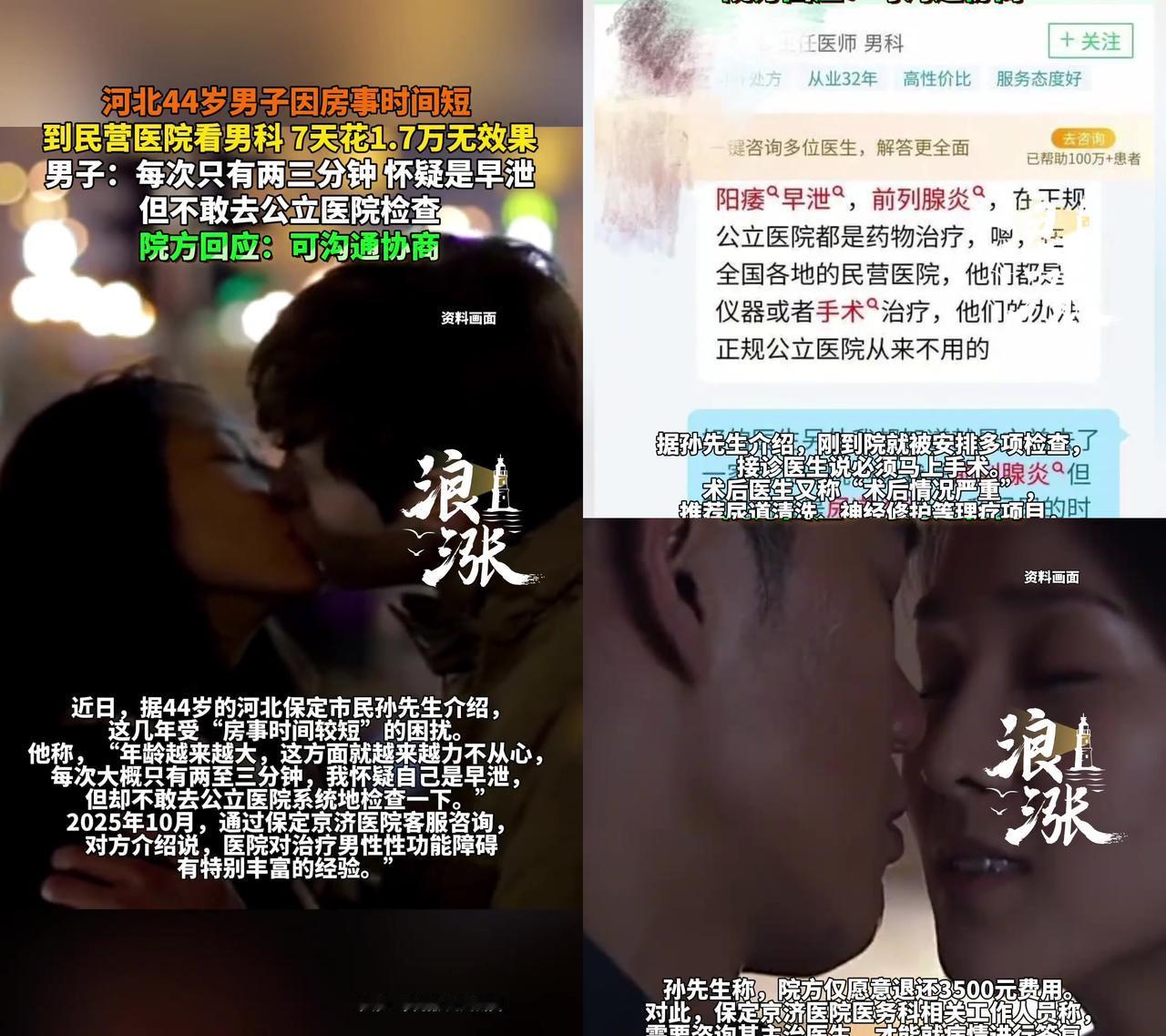 河北44岁大哥怕社死去民营男科,结果花1.7万没效果,反而被抖音曝光了。 大哥说自己房事两三分钟,怀疑早泄,但不敢去公立医院,怕医生问细节尴尬,怕碰到熟人没面子。转头找了保定京济医院,对方拍胸脯说“治愈率八九成”,结果7天做了手术加理疗,花了1.7万,啥效果没有。现在院方说要协商,可钱花了罪受了,面子也没了。 不是我吐槽,这操作真的比社死还绝:怕公立医院的尴尬,就敢信民营医院的打包票?合着大家都说两三分钟是正常范围,到这儿成了得动刀的大病?民营医院是不是把男人的面子当成了按克卖的黄金?你说治不好就算了,现在全抖音都刷得到,本来想藏着的事儿,反而全国人民都知道了,这哪是治早泄,是把社死给升级成全国公演了吧? 更绝的是大家都在说这医院像莆田系老套路,抓准男人羞于启齿的命门,先吓你“这病得治”,再坑你几万块,最后治不好就打发你走。合着这么多年了,还是有人盯着隐私焦虑割韭菜? 最让人难受的不是花了1.7万,而是男人的难言之隐咋就成了某些医院的摇钱树?怕公立医院的尴尬没问题,但也别把命根子交给张口就来的民营医院啊,毕竟面子是小事,被坑得钱没了脸也没了,才是真的亏大了!