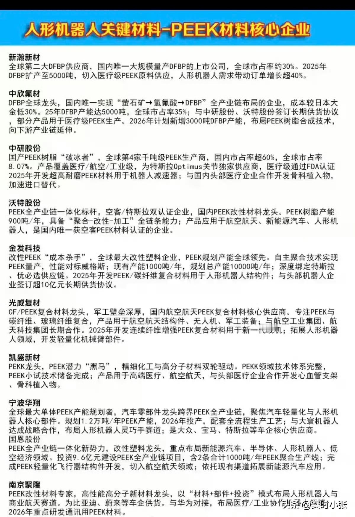 随着人形机器人产业迎来爆发式增长,其核心结构材料PEEK正站在需求爆发的风口。这种兼具高强度、耐磨损与生物相容性的材料,是关节、减速器等核心部件的关键原料,市场需求将随机器人量产快速扩容。 国内已涌现出一批核心企业:中研股份作为国产PEEK树脂“破冰者”,是特斯拉Optimus关节独家供应商;中欣氟材、新潮新材掌握上游DFBP原料,全球市占率领先;沃特股份、金发科技等则在改性与量产领域具备全链条能力,深度绑定头部客户。 这些企业凭借技术突破与产能布局,正充分受益于行业红利,成为PEEK材料赛道的核心龙头。