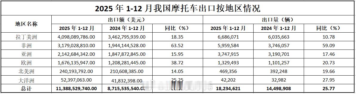 摩托车机车 【海关数据:2025年摩托车整车出口为1823.46万辆,整车进口量为5.81万辆!】2025年1-12月,我国摩托车整车出口量为1823.46万辆,较去年同期增长25.77%,出口额为113.89亿美元,较去年同期增长30.67%。2025年1-12月,我国摩托车整车进口量为5.81万辆,较去年同期下降6.81%,进口额为3.32亿美元,较去年同期下降8.86%。