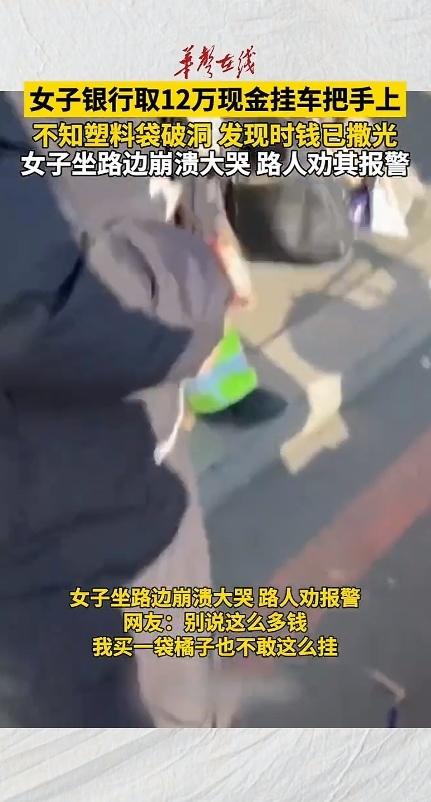 哎呀妈呀!这也太粗心了!怎么能把现金用塑料袋装呢?1月21日辽宁,一位女子刚从银行取出12万现金,顺手就把钱装进黑色的塑料袋子里了,然后把塑料袋往电瓶车把手上一挂,骑车就走了。 结果她完全没发现袋子破了个大洞,等反应过来的时候,12万现金已经在不见了,真的是撒得一干二净。 她知道钱丢了之后,瞬间不淡定了,只见她蹲在路边崩溃大哭,嘴里反复喊着:“啊啊丢了!现金丢了!” 路人听到哭声,赶紧询问原因,这才知道女子丢了12万元,路人看着心疼,赶紧劝她:“哭也没有用呀,赶紧报警吧!” 此事传到了网上,有的网友说:“安全意识太差了,银行取大额现金的时候,不是会给专用的保密袋吗?怎么就用个破塑料袋?” 也有的网友说:“买橘子都得用个结实的袋子,这大姐心也太大了,把钱当白菜挂车上。” 还有的网友说:“真心希望警察能帮忙找回一些,不然这年都没法过了。”  12万啊,可能是一家人省吃俭用好几年的积蓄,也可能是准备买房、看病的救命钱。就因为一个破塑料袋、一个随手的动作,瞬间没了,这事搁在谁的身上,能不崩溃呢? 其实,这种事情时有发生,很多人根本意识不到意外的发生。可能她急着办事,可能觉得“就一小段路没事”,可生活就是这样,往往在你最不经意的地方给你狠狠一击。 这件事也给所有人提了个醒:大额现金一定要贴身保管,哪怕多花几分钟,也不能着急,一定要找到一个找个稳妥的法子,千万也别拿自己都血汗钱赌。 如果没有出现意外,一切都好说,万一真的出现意外了,真的要了老命了!