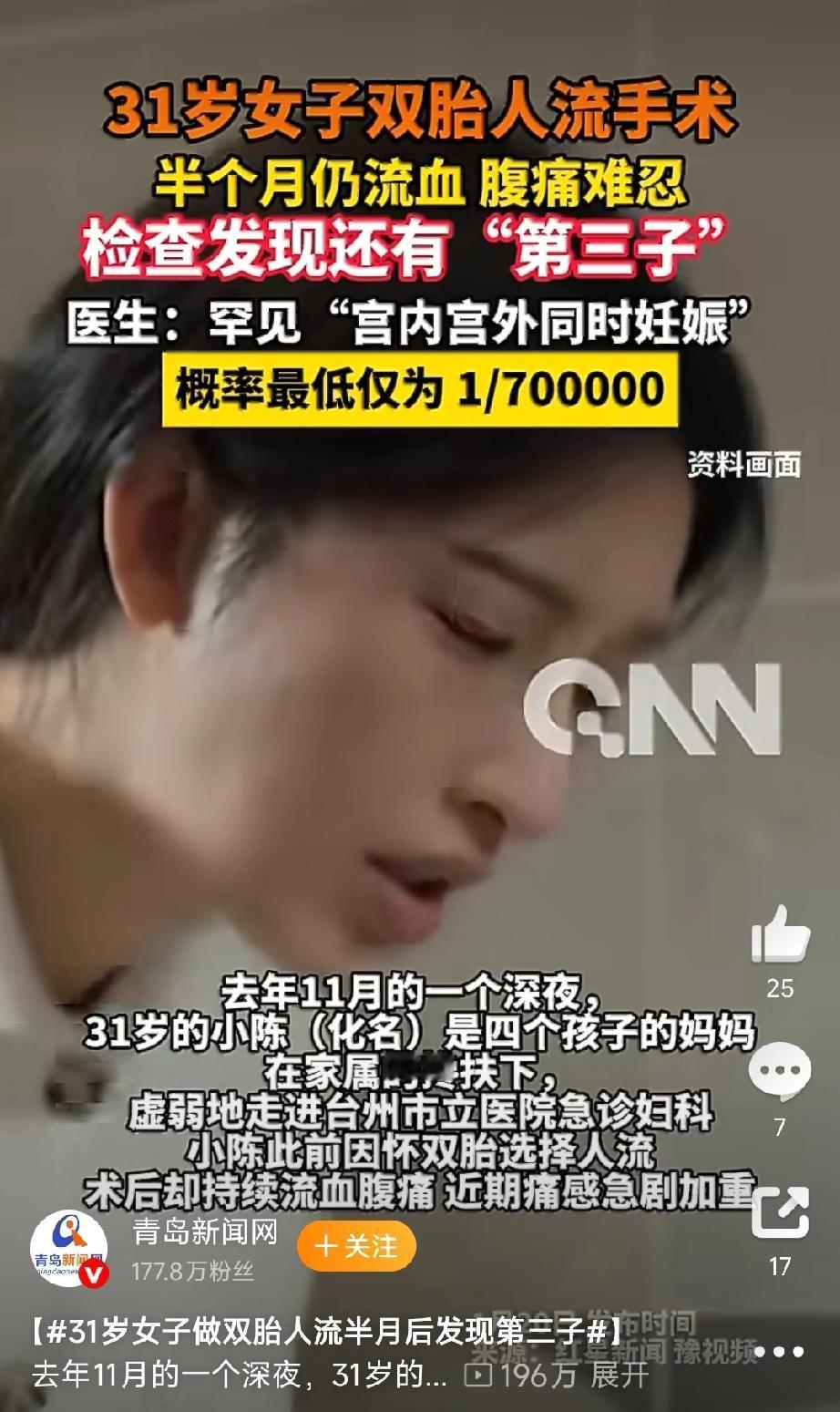 什么阴间新闻, 生了四个,打掉肚子里两个,没想到还有一个! 浙江31岁的四孩妈妈,意外怀孕双胞胎,去医院流产后还是腹痛不止,最后竟然发现输卵管上还有一胎。 这是宫内宫外同时有胚胎着床了! 都已经有四个孩子了,他们一点生活常识也没有吗,都不知道避孕的吗? 先不说异位妊娠很危险,就是普通流产次数多了也不行吧! 女生,一定要爱护自己的身体呀!