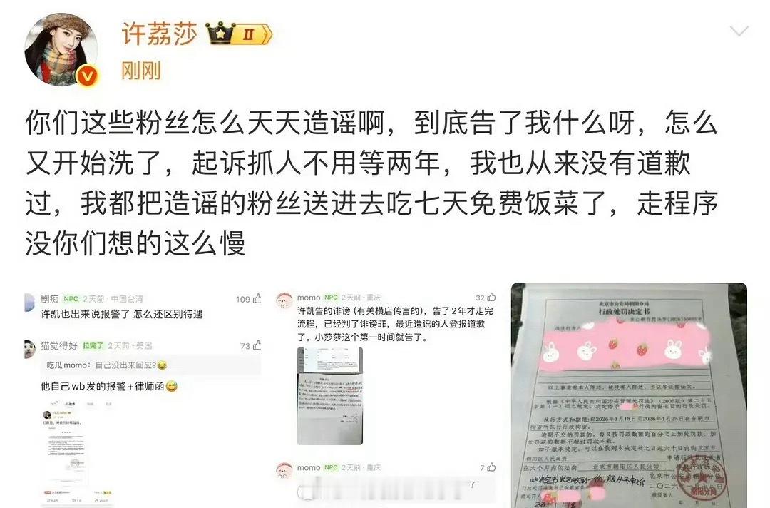 许荔莎说她把造谣的粉丝送进去吃了七天的免费饭菜,好刚啊。