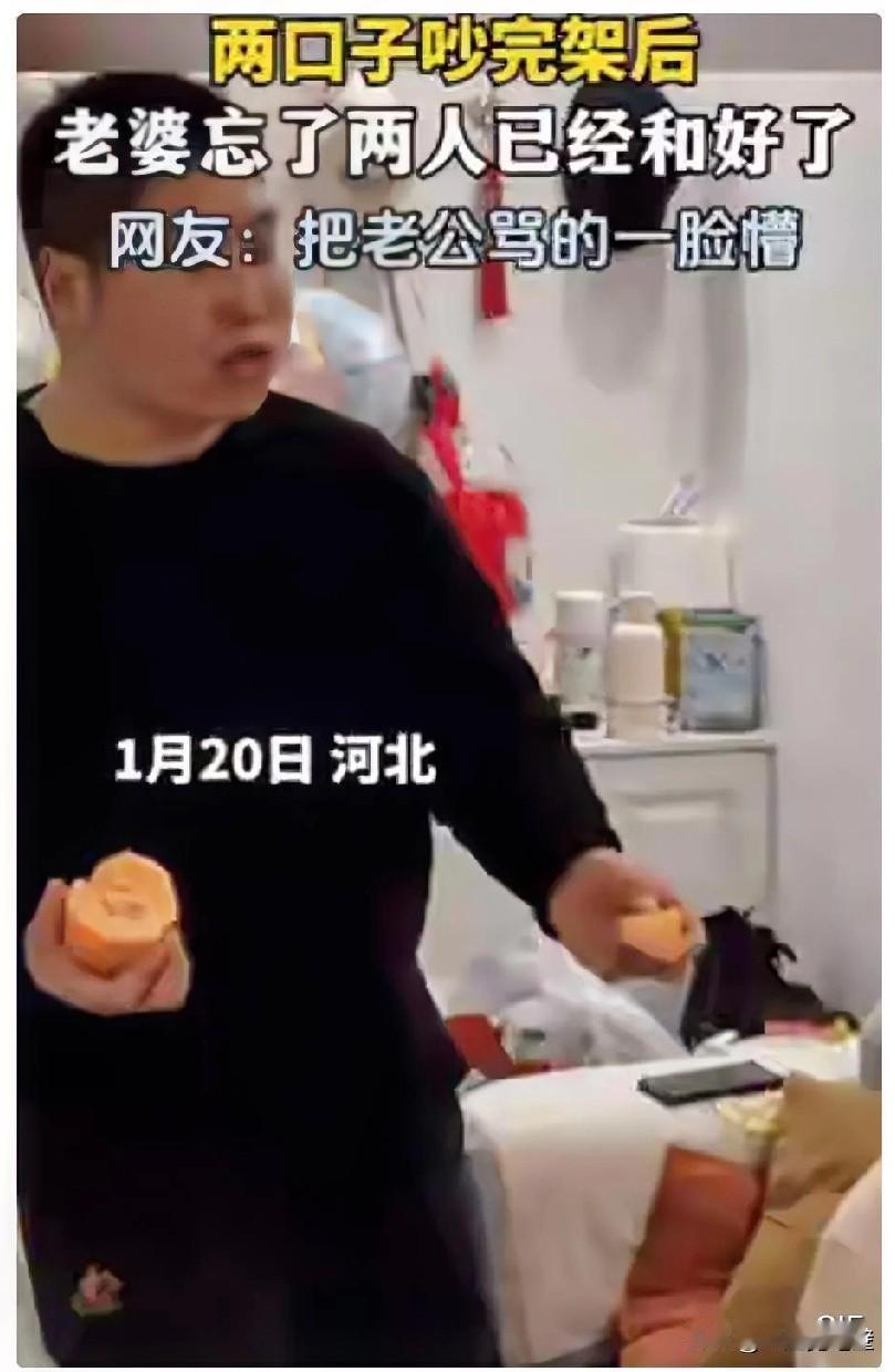 “这才叫真夫妻!”河北,两口子因琐事吵架,丈夫主动服软,2人很快和好!不料,老公想剥橘子给老婆吃,老婆竟然把两人和好的事给忘了 她都不要吃。丈夫满脸委屈:“我都跟你道歉了,你怎么还生这么大的气啊!” 这时,妻子才恍若无物:“你什么时候跟我道歉了?我怎么不知道啊?” 丈夫:“我怎么会忘记呢?我可是心里一直记着呢!”这时,妻子才反应过来:“哎呀,我怎么忘记了这么重要的事啊!” 随即将丈夫剥好的橘子拿过来吃了!生活中的小争吵,小误会,甚至“选择性失忆”,在我们看来却是温馨的画面; 在夫妻生活中时常发生的“小脾气”,也给我们的生活增添了许多趣味! 你们夫妻生活也是这样的吗?