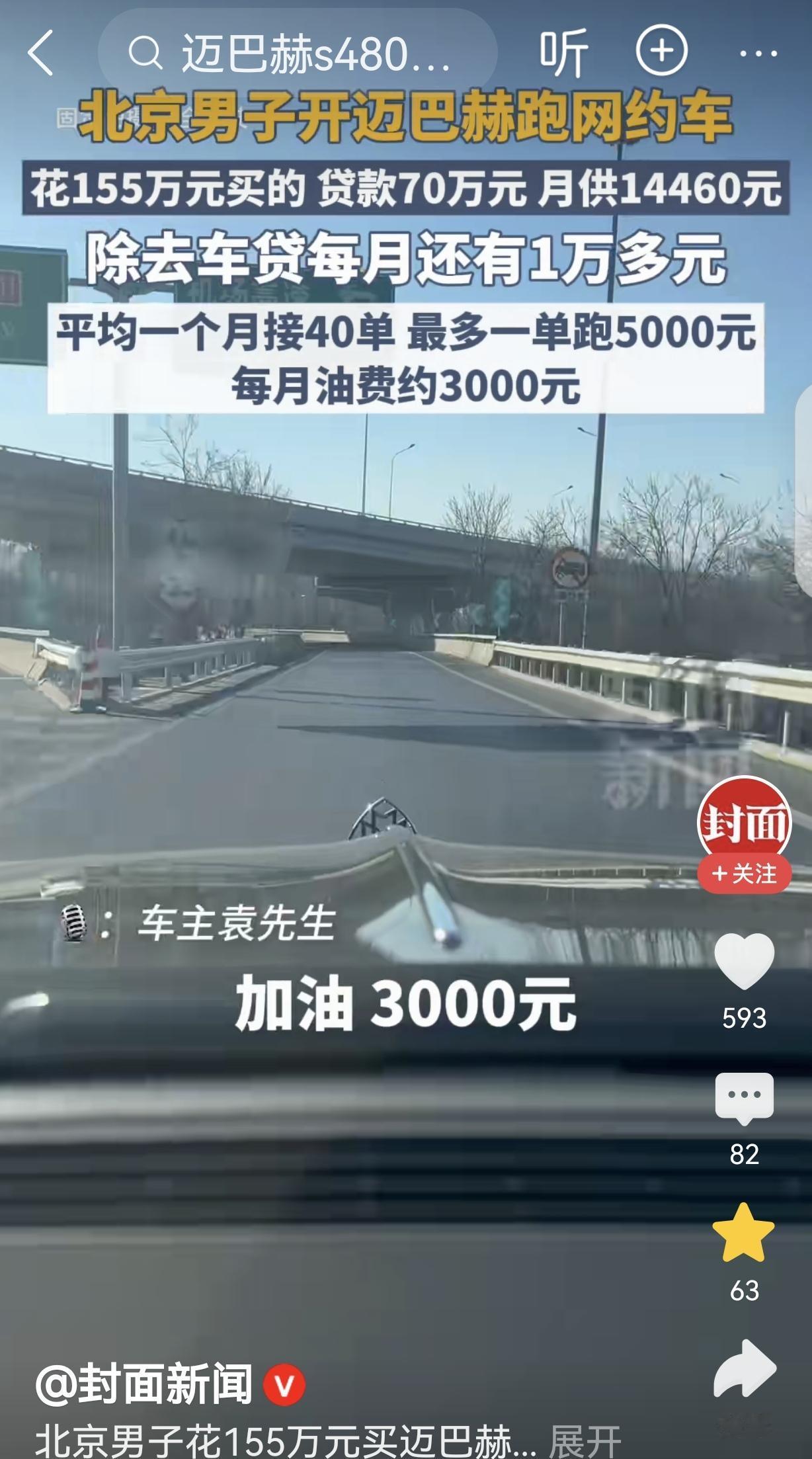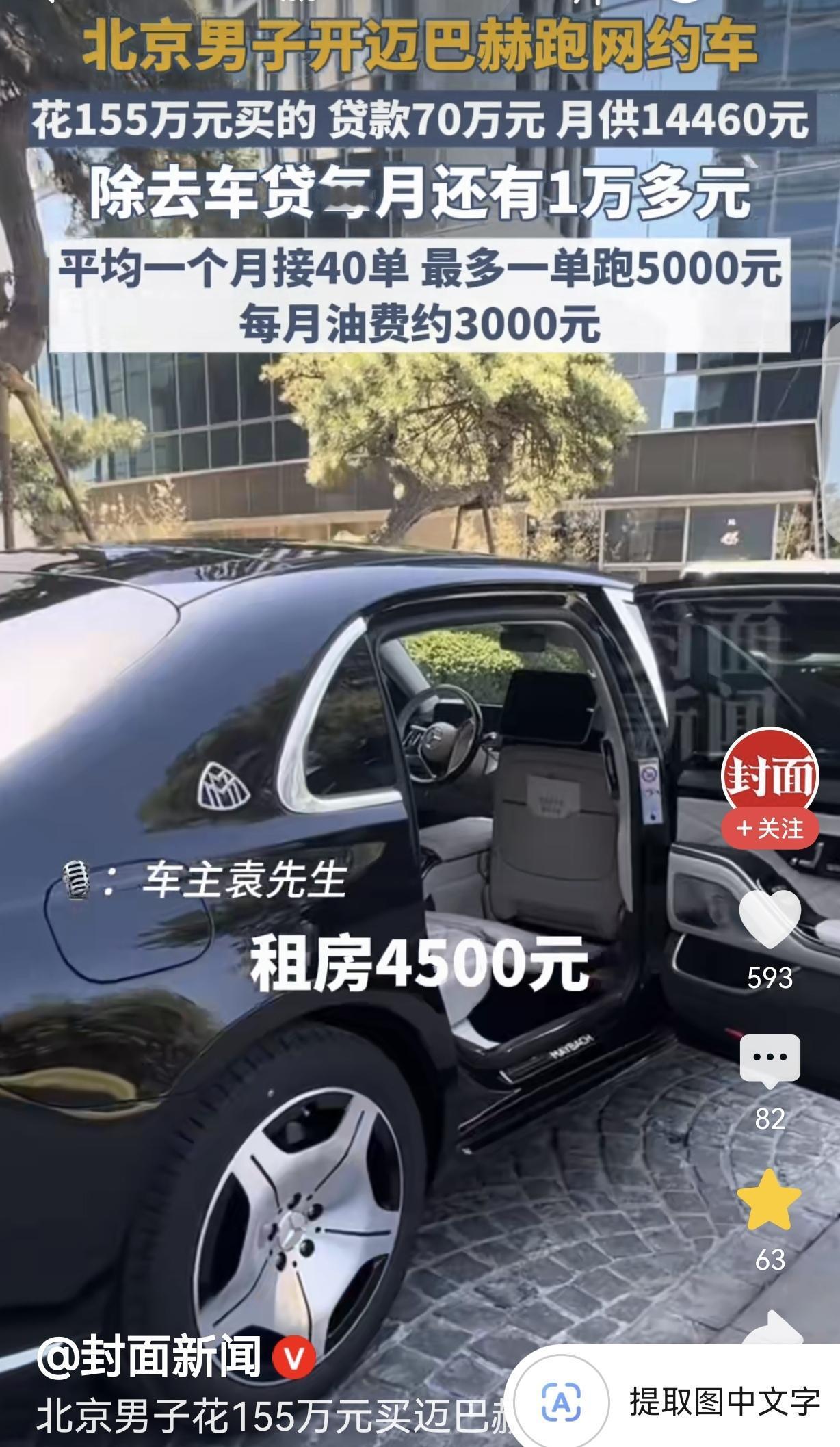 “真牛掰!”北京,一30岁男子看开网约车太卷,决定一不做二不休,直接首付68万,贷款70万,买了辆155万的迈巴赫S480跑滴滴,别人都觉得他疯了,他每月还完14460的车贷,除去加油3000,吃喝2000-3000,租房的4500,每月还能挣10000多,平均一个月接40单,最多一单跑了5000元,男子得意洋洋的说:30岁开着迈巴赫,每天睡到自然醒,简直不要太美! 袁先生在北京跑了6年的网约车,可他却感觉这行业越干越卷,挣钱也越来越难。 但如果不干这行,自己没有一技之长,一时半会找不到可以安身立命的营生。 思来想去,袁先生有了个孤注一掷的想法,他没急流勇退,反而拿出身家性命,也就是他6年网约车生涯攒下的全部家当,一共50万。 袁先生又东挪西借了18万,直接去了4S店,首付68万,贷款70万,买了全部下来总计155万的迈巴赫。 而袁先生开着派头十足的迈巴赫,竟然加入浩浩荡荡的网约车行列,这可让他的亲戚朋友吃惊不已。 开这么贵的豪车接单,大家都担心有人敢下单吗?他能接到单吗?如果挣不到钱,每月14460车贷怎么还?还不上月供,征信就有了污点,背了那么多的债,这辈子还有翻身之日吗? 大家都替袁先生捏了一把汗,可他却信心满满的开始了迈巴赫的滴滴生涯。 让人始料不及的是,袁先生一段时间干下来,不但每个月的车贷轻松还完,而且去掉3000的油钱,两三千的饭钱,还有4500的房租,他还能挣个万八千的。 关键是,这万八千的,袁先生挣起来轻松加愉快,不用起早贪黑,每天都能睡到自然醒,因为他接单不靠数量,只要质量,平均每个月接40单,最高的一单挣了5000元。 袁先生觉得,自己30岁的年纪,就开上了梦寐以求的迈巴赫,而且还能用这辆车挣钱,真是快哉乐哉! 有人说,别的我都信,这车,邮费一个月3000?看不起迈巴赫呢! 有人认为,155万的车贷款70万也算有钱人了,但是买辆70万的,贷款40万,留着40万放银行不是更好吗? 车损十年145万!平均一年保养2万!合计一年折损16.5车均每天500左右。请问你还剩什么?我算算,1个月结余1万多,咱们久按1.5万算!1.5*12*8=144 ,8年保险,保养多少钱? 开这样的车接单是属于专车,豪车,那专车豪车入门价多少,50万的能跑吗?这男的不是蠢就是傻。 对此,你怎么看? 关注@灋律盐究员