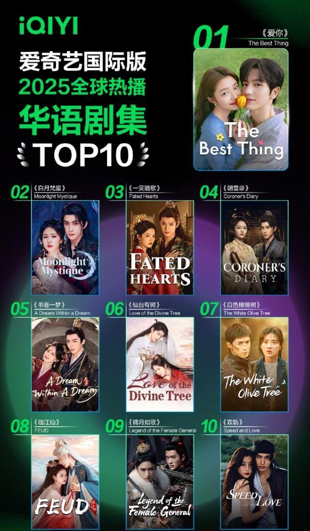 爱奇艺国际版2025全球内容热播榜发布 第一名张凌赫的《爱你》,第二名白鹿的《白