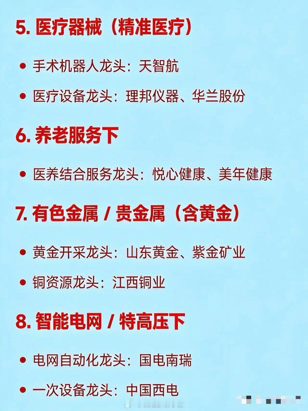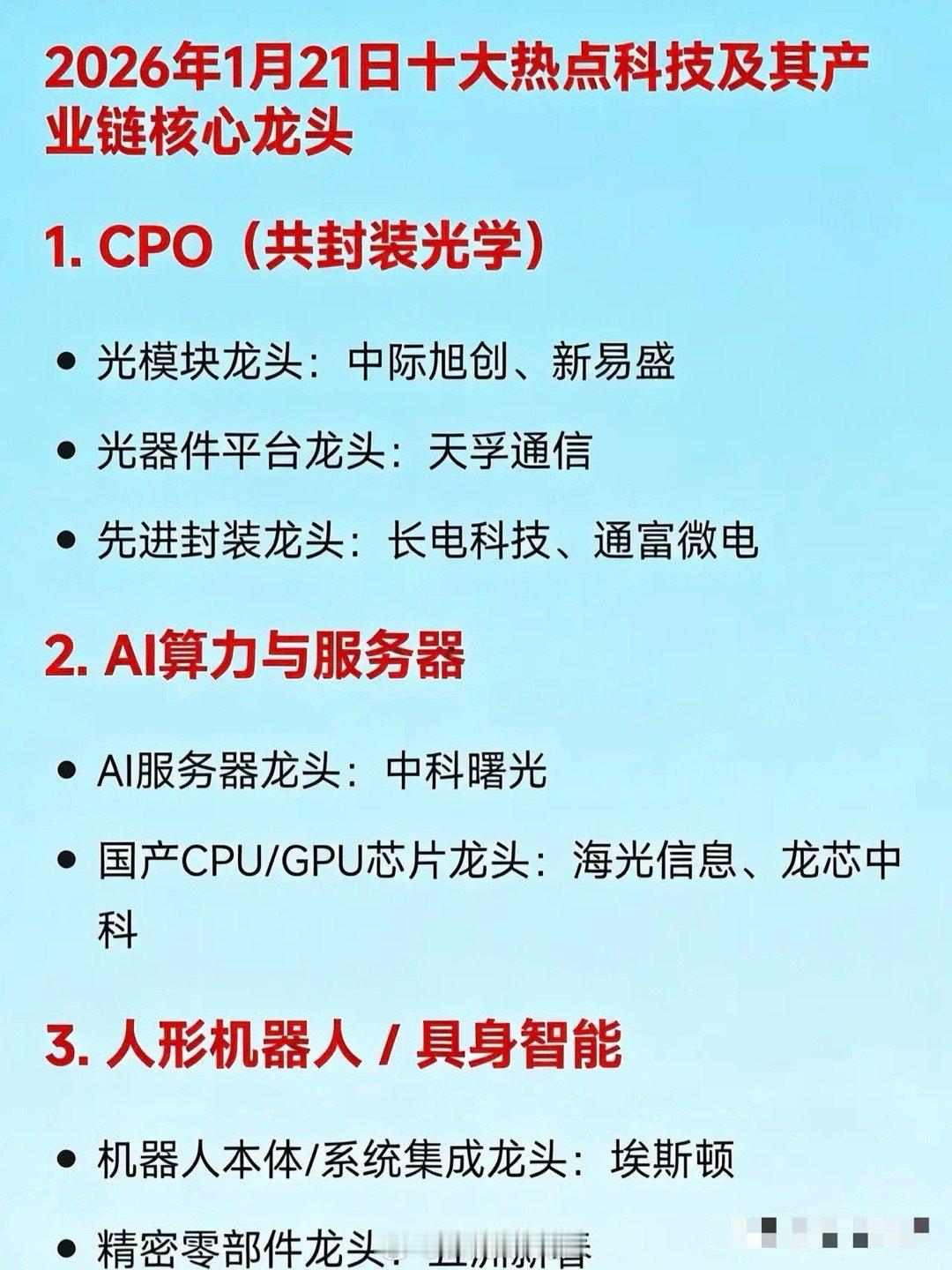 2026年1月21日十大热点科技及其产业链核心龙头1. CPO(共封装光学):光模块领域,中际旭创和新易盛为龙头企业。天孚通信是光器件平台龙头。先进封装方面,长电科技、通富微电占据领先地位。2. AI算力与服务器:中科曙光是AI服务器龙头企业。国产CPU/GPU芯片领域,海光信息和龙芯中科表现突出,是该细分领域的龙头。3. 人形机器人/具身智能:机器人本体及系统集成方面,埃斯顿为龙头。五洲新春是精密零部件龙头,而中航重机、豪能股份则是减速器/关节部件的龙头企业。4. 存储芯片:兆易创新是存储芯片设计龙头。晶圆代工领域,中芯国际占据主导地位。封测环节,长电科技和华天科技是龙头企业。5. 医疗器械(精准医疗):在手术机器人领域,天智航是龙头企业。理邦仪器和华兰股份则是医疗设备方面的龙头。6. 养老服务:悦心健康和美年健康是医养结合服务领域的龙头企业,为养老服务市场提供重要支撑。7. 有色金属/贵金属(含黄金):黄金开采领域,山东黄金和紫金矿业是龙头企业。江西铜业则是铜资源领域的龙头,在相关产业链中具有重要影响力。8. 智能电网/特高压:国电南瑞是电网自动化龙头。中国西电是一次设备龙头,特变电工则在变压器工程领域占据龙头地位。9. 商业航天/卫星互联网:中国卫星是卫星制造龙头企业,航天电子则是航天电子系统的龙头,二者在商业航天与卫星互联网产业链中发挥关键作用。10. 新能源(风光储锂):储能电池领域,宁德时代是龙头企业。阳光电源是光储逆变器龙头。锂资源方面,赣锋锂业和盛新锂能是龙头企业,掌控着重要的锂资源储备与开发能力。