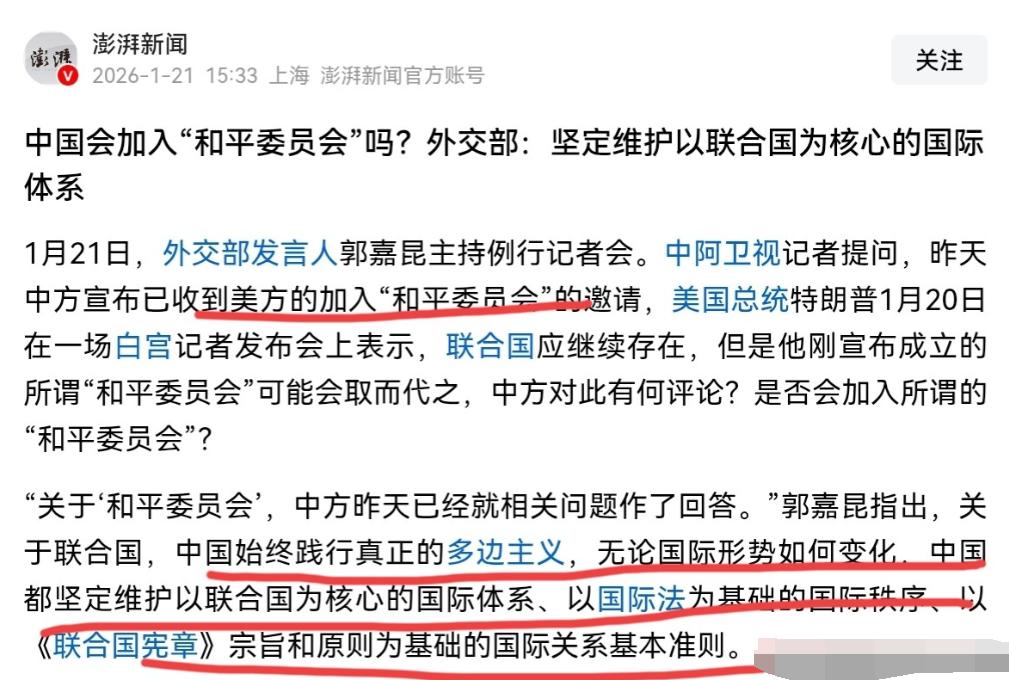 中国正式作出回应!美国的邀请被我们拒绝了?在美国邀请我们加入“和平委员会”之后,1月21日,我们的外交部发言人对此进行了回应。我们的外交部发言人表示,中国始终践行真正的多边主义,无论国际形势如何变化,中国都坚定维护以联合国为核心的国际体系、以国际法为基础的国际秩序、以《联合国宪章》宗旨和原则为基础的国际关系基本准则。 中国为啥拒了美国的“和平委员会”?这事得从根子上捋。美国这次牵头搞的所谓“和平委员会”,说是要解决中东问题,可明眼人都瞅得明白,这是特朗普政府换汤不换药的老套路。 表面喊着“和平”,实则想绕开联合国自己说了算,把中东局势变成“美国生意”。就像村头开茶馆的,嘴上说“大家来喝茶聊天”,实则只让掏得起钱的坐主桌,穷邻居连门槛都不让进。 咱外交部回应说得清楚:中国只认联合国这个“主心骨”。这话不是空话,是有历史和现实打底的。打1971年恢复联合国合法席位那天起,中国在联合国投的每一票、说的每句话,都是照着《联合国宪章》来的。 比如去年巴以冲突,中国推动安理会通过停火决议,实打实斡旋;沙伊复交那会儿,咱们也是拉着双方坐下来谈,没搞任何小动作。 这和美国的做法截然不同,美国的委员会,成员由总统点名、捐款10亿就能当永久会员,妥妥的“金钱投票”,跟联合国讲的主权平等、协商一致完全背道而驰。 有人可能纳闷:多个平台解决问题不好吗?可问题在于,联合国是193个国家一起搭起来的台子,而美国这个委员会,本质是“小圈子俱乐部”。 举个直白的例子:村里要修路,联合国是召集全村开会,各家出主意凑钱;美国却自己拉了几个财主,说“我们出钱修,路怎么修我说了算”。 结果呢?财主们只想从路上捞好处,穷人家的地被占了都没处说理。这就是为啥多数受邀国态度含糊,只有匈牙利跟着吆喝。大家都知道,脱离联合国的“和平”,早晚变成“美国的和平”。 中国拒绝,还有更深层的考量。咱讲究“授人以渔”,美国却爱“越俎代庖”。就说维和这事,中国是安理会常任理事国里出兵最多的,派了5万多人次的“蓝盔”,在南苏丹、马里扛着枪保护平民,一分钱不赚。 美国呢?嘴上喊着“维护秩序”,却动不动绕开安理会搞单边制裁,去年对叙利亚的制裁直接让当地缺医少药,这叫哪门子和平? 中东问题的根子,是巴勒斯坦的主权一直被架空,美国的委员会却把“巴人治巴”当口号,实际想扶持听话的代理人,这和中国主张的“两国方案”压根尿不到一个壶里。 再往远了看,中国为啥死磕联合国体系?因为吃过亏。新中国刚成立那会儿,被美国堵在联合国门外20多年,深知没有多边平台,小国的声音就会被淹没。现在咱们强大了,更明白维护联合国权威不是为了“当官”,而是给全球70亿人留个说理的地方。 就像去年联合国未来峰会,中国提出的全球发展倡议,拉了150多个国家一起搞基建、抗疫情,这才是真多边主义。不是少数人分钱,而是大家一起干活。 有人可能觉得,拒绝美国会不会显得“不合群”?看看现实就知道:去年中国促成柬泰对话,没用一枪一炮;今年在乌克兰问题上,咱始终劝和促谈,和全球南方国家站在一起发声。 这些事儿证明,真正的和平不是靠“委员会”头衔堆出来的,而是靠实实在在的行动。美国的委员会,说白了是想把水搅浑,方便自己捞好处;中国拒绝,恰恰是不想让中东变成第二个乌克兰,不想让联合国70多年的家底毁在单边主义手里。 说到底,中国的外交从来都是“认理不认人”。联合国宪章写着“主权平等”,咱就照着这个理走;美国想搞“新冷战”小圈子,咱就把门关紧。 这不是赌气,而是看透了一个道理:在中东问题上,绕过联合国的“和平”,终究是沙滩上的城堡,潮水一来就散了。中国宁可站在联合国的老地基上,一砖一瓦地垒,也不愿跟着美国踩进烂泥坑。这,就是大国的担当。