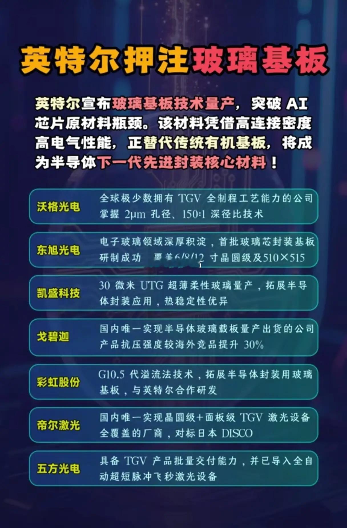 玻璃基板,真能让半导体封装“换道超车”?当英特尔突然官宣玻璃基板技术量产,喊出“突破AI芯片材料瓶颈”时,全球半导体产业链都在屏住呼吸:这是一场材料革命的序章,还是又一次资本炒作的噱头?在AI算力爆炸式增长的今天,传统有机封装基板早已力不从心——信号延迟、散热不足的短板,正在成为高端芯片性能释放的“枷锁”。而玻璃基板凭借高连接密度、优异电气性能的天生优势,恰如一把解锁瓶颈的密钥,正以“替代者”姿态闯入先进封装的核心战场。英特尔的押注绝非孤例,当ChatGPT掀起的算力竞赛倒逼封装技术迭代,玻璃基板从实验室走向量产,本质是产业需求与技术积累的双向奔赴。更值得关注的是,这场变革里中国企业并非旁观者。从沃格光电掌握2μm孔径的TGV全制程工艺,到东旭光电率先研制出覆盖多尺寸的玻璃芯封装基板;从戈碧迦成为国内唯一实现半导体玻璃载板量产的企业,到彩虹股份与英特尔联手研发G10.5代玻璃基板,国内产业链已在材料、设备环节完成关键布局。帝尔激光的TGV设备对标日本DISCO,五方光电实现TGV产品批量交付,更印证着中国企业正从“跟跑”转向“并跑”,在细分领域甚至具备了反超的底气。展望未来,玻璃基板的渗透速度将直接绑定AI芯片的迭代节奏。短期看,高端AI算力芯片会率先完成材料切换,带动产业链上下游技术成熟;长期看,随着良率提升与成本下探,消费级芯片的封装升级将打开更广阔市场。而国内企业的深度参与,不仅能缓解“卡脖子”焦虑,更有望在全球半导体格局中抢占先进封装的话语权。当然,良率爬坡、设备适配的挑战仍在,但当我们不再被动等待技术转移,而是主动在新材料赛道与巨头同台竞技时,玻璃基板或许不只是半导体的下一个风口,更是中国产业突围的一次关键契机——毕竟,真正的超车,从来都是换道先行。