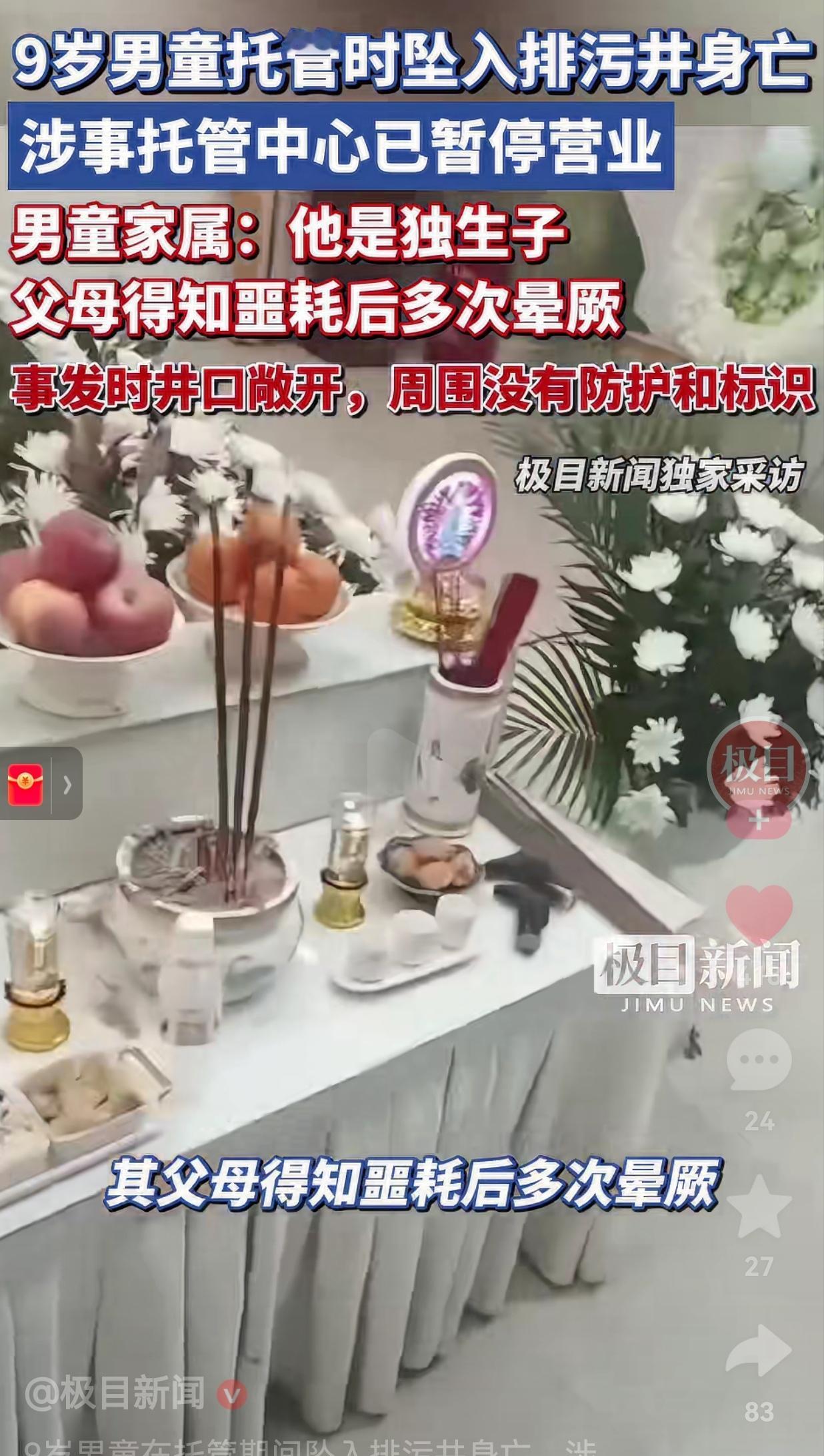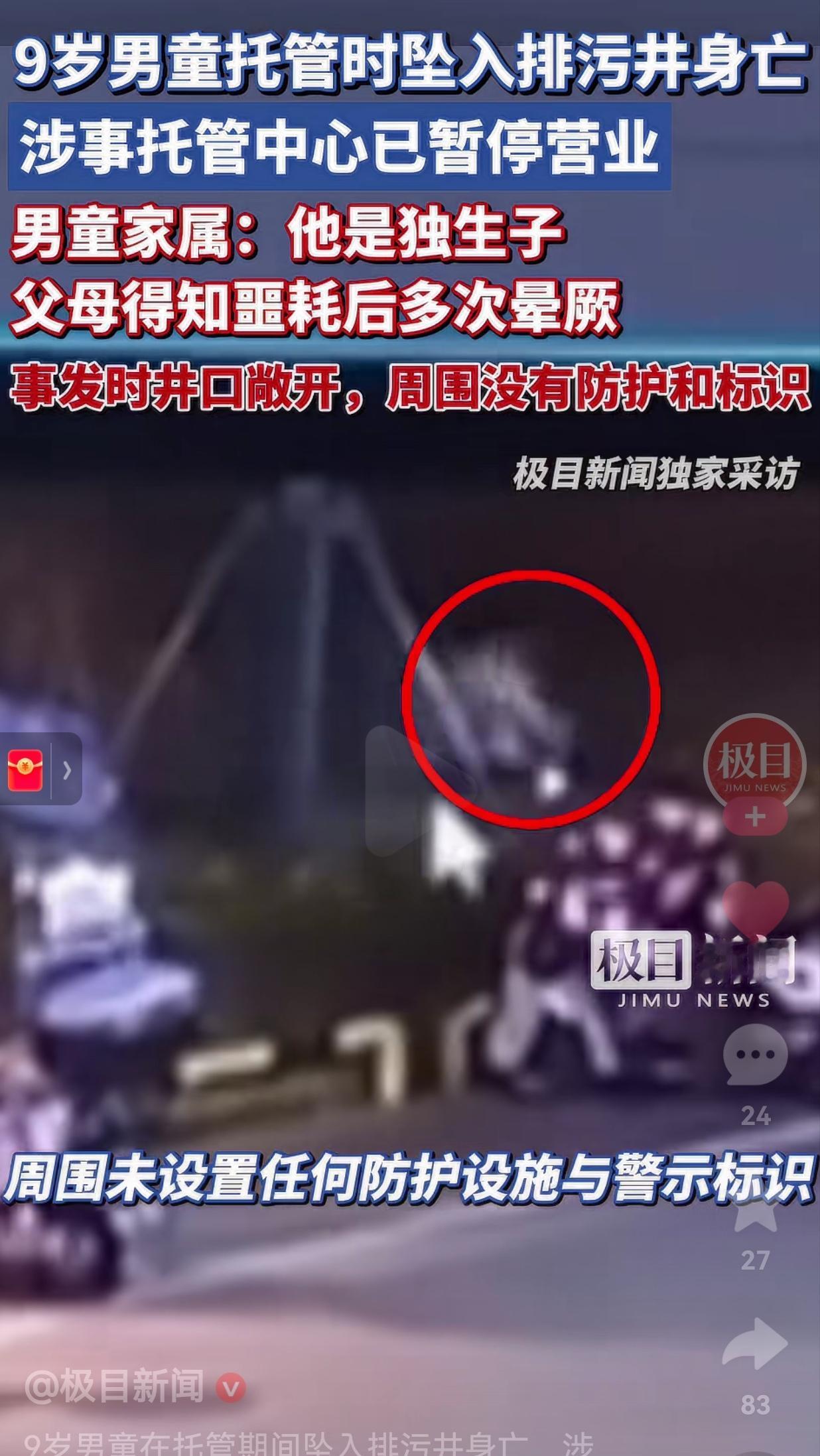 父母有多心痛呀!好好的一个孩子,付出了这么大的心血,说没就没了,人家孩子的父母可怎么面对以后的生活呀!想想都痛彻心扉! 近日,福建宁德,一个9岁的小男孩在托管中心期间,坠入了一口敞开的排污井,最终不幸身亡。 更让人揪心的是,事发时井口不仅没有井盖,就连周围也没有任何防护设施和警示标识,就像一个隐形的陷阱。 孩子可能因蹦跳时井盖移位而发生意外,而当时托管老师竟以为孩子在捉迷藏,没能及时发现异常。 据受害者家属张女士介绍,外甥是家里的独生子,父母得知噩耗后多次晕厥。 目前,涉事托管中心已经暂停营业,监控视频也已全部移交警方。 事发后,相关部门才在井口设置了石墩和“此处有排污井,请绕行”的标识,但这迟到的防护,再也换不回那个鲜活的生命了。 此事引发无数网友的热议,有的网友说:“一个9岁的孩子,就这么没了……我真的看哭了,太心疼了。” 也有的网友说:“托管老师以为孩子在捉迷藏?孩子交给你们,就是让你们这么看的吗?” 还有的网友说:“每次看到这种悲剧的发生,真的很无力,安全经常提,却没有做到位,孩子太无辜了。”  9岁,正是活泼好动,爱凑热闹的年纪,他本该在阳光下嬉笑玩耍,却因为一个敞开的井口、一次疏忽的监管,永远停留在了这个冬天。 这件事让人无比痛心,也给所有人敲响了警钟:涉及到未成年人安全真的要落实到位,在孩子玩耍的地方,一定不能马虎,各个部门一定要做到心里有数,不要让这种悲剧再发生了!我们真的承受不了。 (信息来源:极目新闻)
