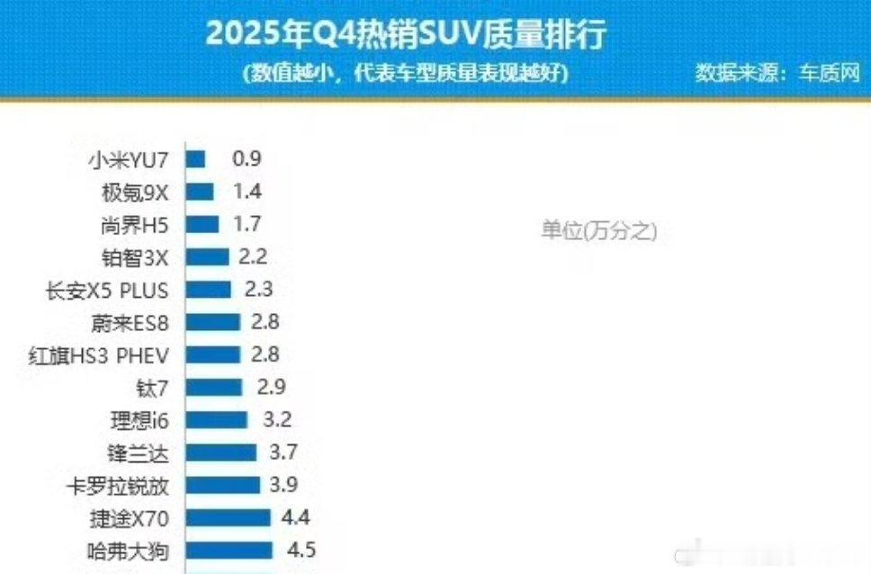 小米YU7获得SUV质量排名第一当初说YU7用消费级芯片,可靠性不行的朋友评论区聊聊车质网说明YU7相当可靠啊,质量投诉比例全市场最低