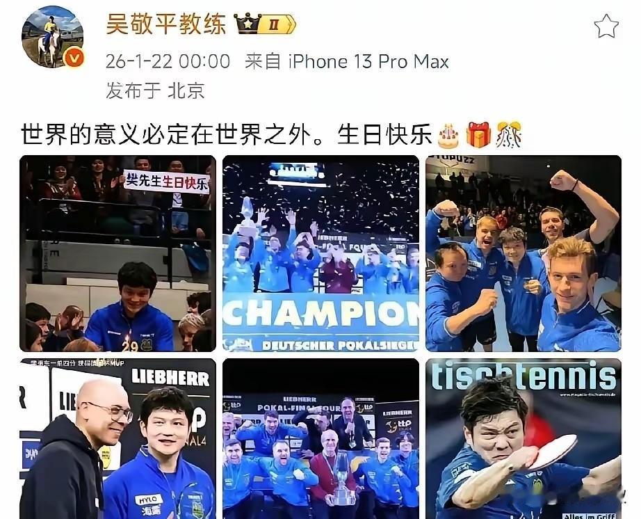 吴敬平又是卡点给樊振东送上生日祝! 吴敬平一生不少徒弟, 从马琳、王皓两个直板, 到陈玘、许昕、王楚钦三个左撇子! 唯独对樊振东有一种偏爱! 在老师心目中, 最喜欢的徒弟不是当多大官, 而是在乒乓球技术层面, 有种孜孜不倦的追求! 东哥在乒乓球界, 妥妥的学霸!