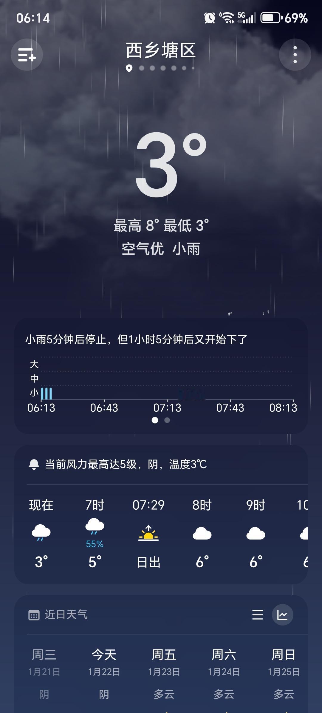 南宁的晚上吃剩的菜,终于不用放冰箱了。 今天早上6:10分起来给小孩做早餐,发现气温竟然降到了3摄氏度。刚好比冰箱低一度。这温度是南宁今年最低的温度了,关键留着毛毛雨。 7点钟送小孩到学校后,回来的时候,7:10分。突然间下起了中雨,路上看到几个中学生骑着自行车,连雨衣都没有穿。衣服和头发一下子全被雨淋湿了,看着心里很不是滋味。 这样的天气,被雨淋湿头发,感冒的概率几乎可以达到90%以上。也不知道这些学生的家长咋就那么粗心!南宁温差实录 家长没送小孩上学可以理解,但平时整天拿着手机刷屏,总应该刷刷天气预报,给小孩提醒一下啊! 另外,以后真不再想听到有人说中学生8:10分才开学上课!