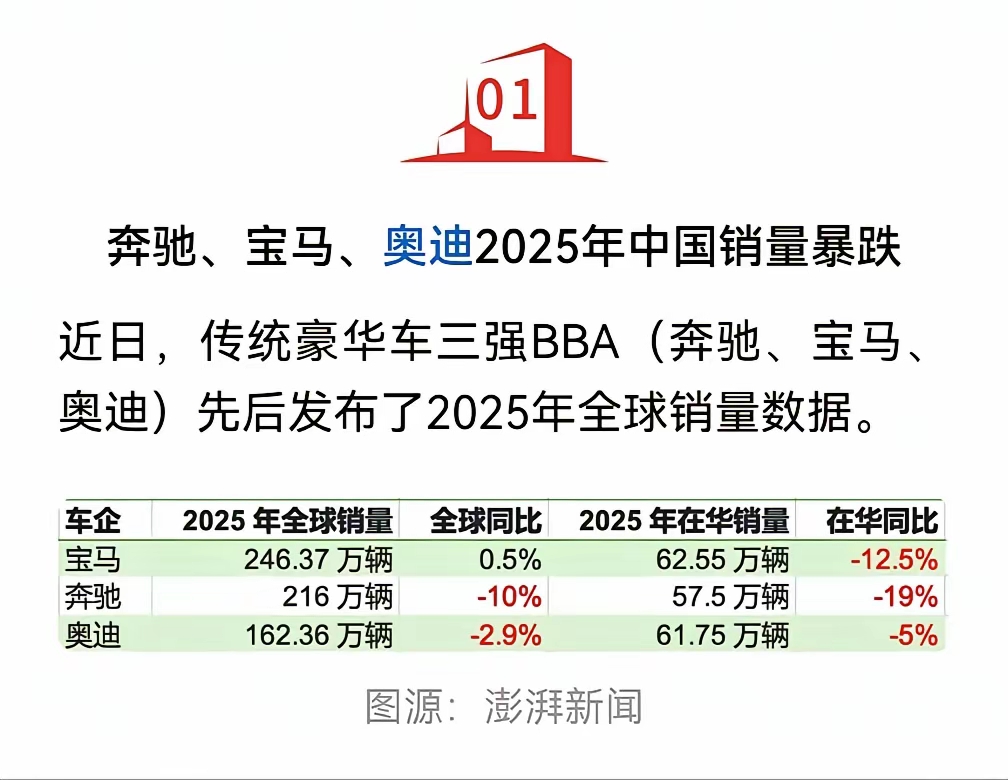 昨晚跟一个卖车的兄弟撸串,听他倒苦水,我酒杯都端不稳了。 三个消息,一个比一个炸耳朵。 第一,BBA彻底卖不动了,不是小打小闹,是墙倒众人推那种。 去年上半年,奔驰利润腰斩,直接没了55.8%。宝马和奥迪也没好到哪去,一个跌29%,一个跌37.5%。在中国,奔驰少卖了14%,宝马更狠,少了15.5%。 什么概念?三家加起来,半年就比前年少卖了将近14万辆车。销量数字一夜之间,好像被一巴掌扇回了七八年前。 曾经的护城河,现在看,跟围住自己的围墙没啥两样。 第二,国产车不是崛起,是踹门。 市场大盘子还在涨啊。去年全国车子总销量冲到了3440万辆。那BBA丢掉的份额,被谁吃了? 答案都写在销量榜上:去年中国品牌乘用车,每卖10辆,差不多有7辆是国产的,份额干到了69.5%。比亚迪一家就卖了214万多辆,同比涨了33%。 理想、蔚来、问界这些,在30万以上的地盘跟BBA抢饭吃,抢得人家“价格倒挂”这种词都出来了。以前是BBA定个价,大家跟着玩。现在反了,国产车把配置和智能座舱堆到天花板,BBA不降价?门都没有。 第三,也是最根本的:买车的兄弟,心态换了。 你以为这只是车圈的事?看看身上穿的。前阵子大降温,火上热搜的不是什么加拿大鹅,是胖东来和山姆店里几百块的羽绒服。大家抢疯了,就因为充绒量实在,价格透明。 唯品会上,波司登、雪中飞这些牌子,价格被打了下来,销量猛增。道理一样:拒绝为虚无缥缈的“溢价”买单,但愿意为扎实的“充绒克重”和核心功能花钱。 从手机、鞋服到汽车,一套逻辑打通了:外国的月亮,没那么圆了。 算算账,BBA疼在哪? 一是里子面子一起丢。走量的中低端车型(比如宝马的X3),被国产车卷得销量大跌,这是摊薄成本的根基。利润丰厚的高端车,需求又疲软。两头一挤,利润像开闸放水一样泄。 二是转型的代价太沉。电动化、智能化,每往前迈一步都是真金白银。但自家电动车卖不动啊,奔驰的纯电车型销量还在下滑。巨额的研发投入,像石头扔进深井,听见响,但还没见到水花。 看看门道,国产车赢在哪? 赢在“主场思维”。智能驾驶、座舱生态,国产车迭代的速度是按“周”算的。BBA呢?还在全球协调、缓慢导入。 现在它们终于醒过神,开始“用中国大脑”。宝马找Momenta和华为合作智驾;奥迪和华为联手;奔驰的车载大模型赶紧拿了个中国的安全证书。但怎么说呢,像学霸开了半个学期,你才借来笔记抄,节奏已经落下了。 更关键的是,年轻人觉得“酷”的定义变了。一块闪亮的车标带来的面子,比不上一套丝滑的语音交互、一个能连续进化的智驾系统带来的实实在在的爽感。这份自信,是国产车用技术一拳一拳打出来的。 最后我那个卖车的朋友嘬了口烟,说:“你看奔驰宝马,现在也学乖了,不再死磕2030年全面电动化了,又说燃油车还要好好做[citation]。说白了,船太大,掉头难,又舍不得燃油车这座还能挖出金子的矿。” 他顿了顿:“但对买车的来说,谁还愿意为那个艰难的‘转身’付高价呢?” 这话,听着像在问BBA,也像在问所有还没回过神的老牌子。