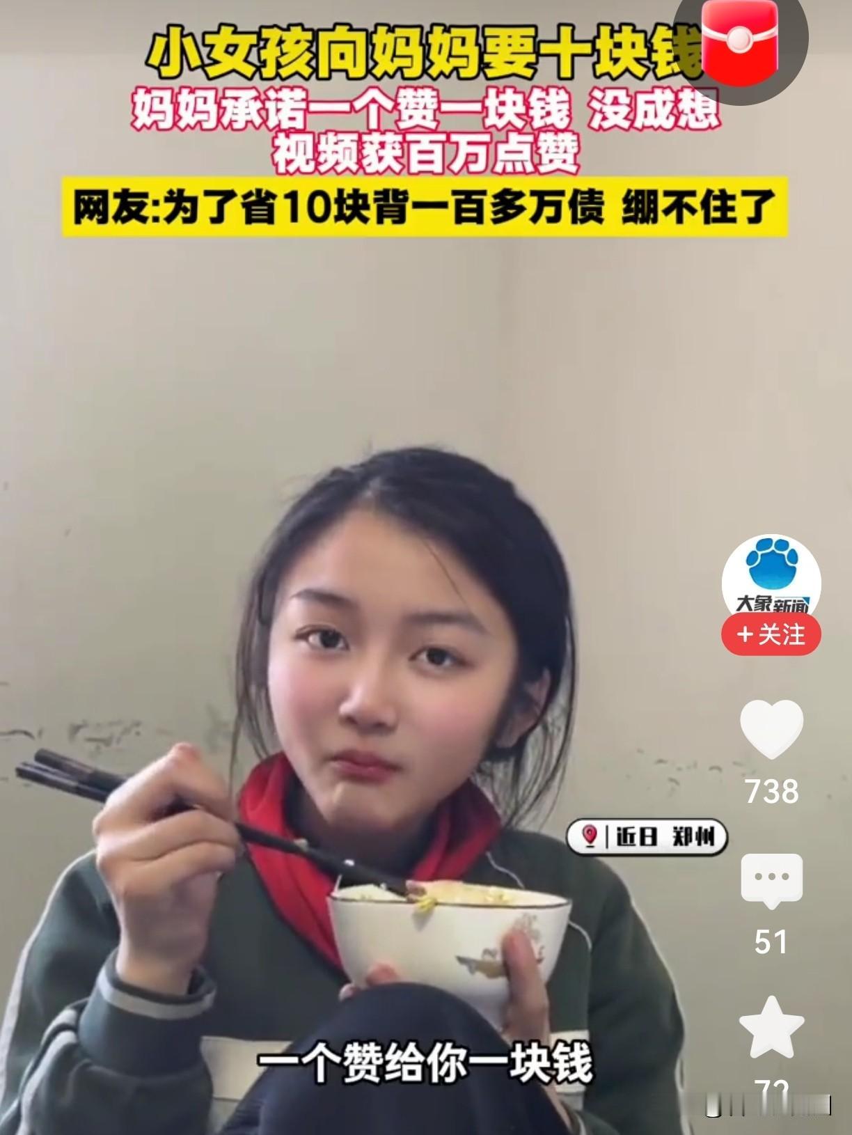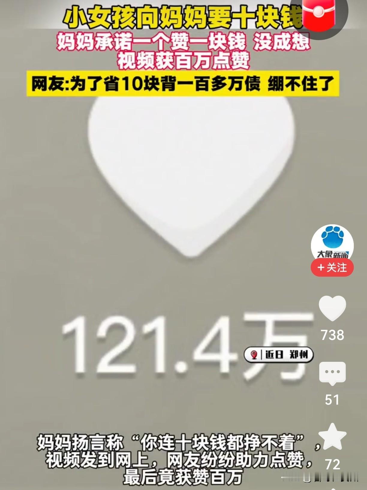 《女儿讨10元零花钱,我随口说“1个赞给1块”,3天后我“欠”了她一套房!》 家有小学生,讨零花钱的套路真是越来越野了!上周我女儿缠着要10块钱买贴纸,我脑子一热,跟她说:“你发条朋友圈求赞,1个赞,妈就给你1块!”本来想着顶天二三十个赞,哄她开心就算了。结果……三天后,我对着手机屏幕冷汗直冒——点赞数破百万,我“欠”了女儿一套房! 这事真的绝了。当初答应她,一是觉得小孩朋友圈能有多少人?二是想顺便锻炼她胆子。我还笑眯眯跟她说:“快去发,赚了钱妈陪你买贴纸!”女儿当真了,举着手机拍了张可怜巴巴的表情:“叔叔阿姨哥哥姐姐,帮忙点赞呀,妈妈说要1个赞1块钱!” 结果第一天晚上,点赞就过了五百。我还在偷笑:“哟,人缘不错嘛!”没想到第二天睡醒,手机炸了——朋友圈被亲戚、同事、甚至十几年没联系的同学疯狂转发,还有陌生网友留言:“阿姨,给孩子点赞了,别赖账啊!”点赞数像坐了火箭:五千、三万、十万……每刷新一次,我手都在抖。女儿却眼睛发亮,每天睡前都掰手指算:“妈妈,现在能买多少贴纸啦?” 最让我哭笑不得的是,她还一本正经跑来跟我签“借款合同”,用拼音写着:“妈妈欠妞妞1000000元,以后慢慢还。”我逗她:“还不起怎么办?”她叉腰:“那你每天多陪我玩半小时!”哎哟,这小算盘打得响。 眼看着点赞破百万,我彻底慌了——真照这么给,全家得喝西北风去。最后我跟女儿盘腿坐地上“谈判”:“妞妞,妈妈真的没那么多钱,但答应你的事绝不耍赖。这样行不行,‘百万债’换成每周2元零花钱,再加一次周末迪士尼之旅,妈妈全程陪你疯!”她眨巴眼睛,居然爽快点头:“好!但妈妈要拉钩,以后不能随口答应做不到的事哦。” 那一刻我真心暖了一下。原来我们随口一句玩笑,孩子会当真;而网友疯狂点赞的背后,也是一片善意接力。这场荒唐的“百万债务”,反而让我俩多了几次拥抱、几晚睡前聊天。孩子想要的哪是钱啊,分明是大人那份认真的陪伴和承诺。 现在女儿偶尔还会晃着手机逗我:“妈妈,我又想发朋友圈求赞了!”我呢?再也不敢随口“开价”了!话说,你们敢跟孩子玩“1赞1元”吗?要是你真“欠”了百万,会怎么收场?评论区等你支招!点赞前三名,我替闺女送她最爱的星空贴纸一套——这次,管够! 亲子约定翻车现场 零花钱还能这样赚