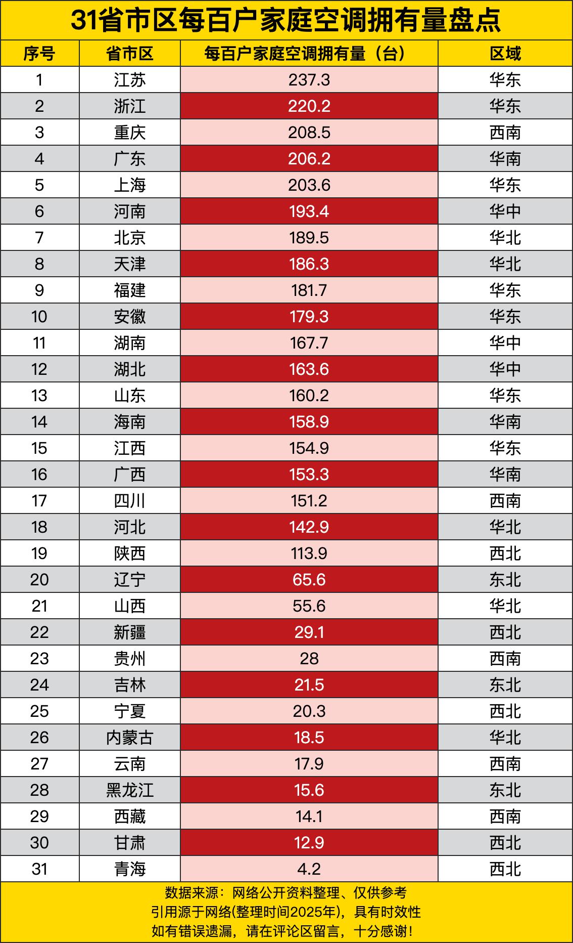 江苏一骑绝尘,每百户家庭拥有237.3台空调,这简直就是“空调大户”,仿佛江苏的小伙伴们都是“怕热星人”,一到夏天,全靠空调续命。浙江也不甘示弱,以220.2台紧跟其后,这两个地方的朋友,是不是家里空调就没怎么停过呀? 再瞧瞧华东地区,真是“群雄逐鹿”。上海、安徽等地的每百户家庭空调拥有量也都名列前茅。不过相比之下,东北和西北的一些省份就显得有点“可怜”了。辽宁每百户才65.6台,黑龙江更是只有15.6台。难道是东北和西北的朋友都天生不怕热?还是说他们有其他避暑的独家秘籍?这也太让人好奇啦! 中南和西南地区的表现也是各有千秋。广东、广西、海南这些南方省份,每百户家庭空调拥有量都在150台以上,看来炎热的天气让大家都离不开空调这个“好伙伴”。而西南的重庆,每百户有208.5台,和华东的强省有一拼,重庆的夏天那可是相当热,空调多也就不奇怪了。 最让人意外的还得是青海,每百户家庭空调拥有量仅仅4.2台,在全国垫底。是青海的气候真的不太需要空调,还是当地居民的消费习惯不一样呢?这数据一摆出来,真是让人忍不住琢磨。不同地区的空调拥有量,背后藏着的可不仅仅是温度的差异,还有好多有趣的事儿等着我们去发现呢!