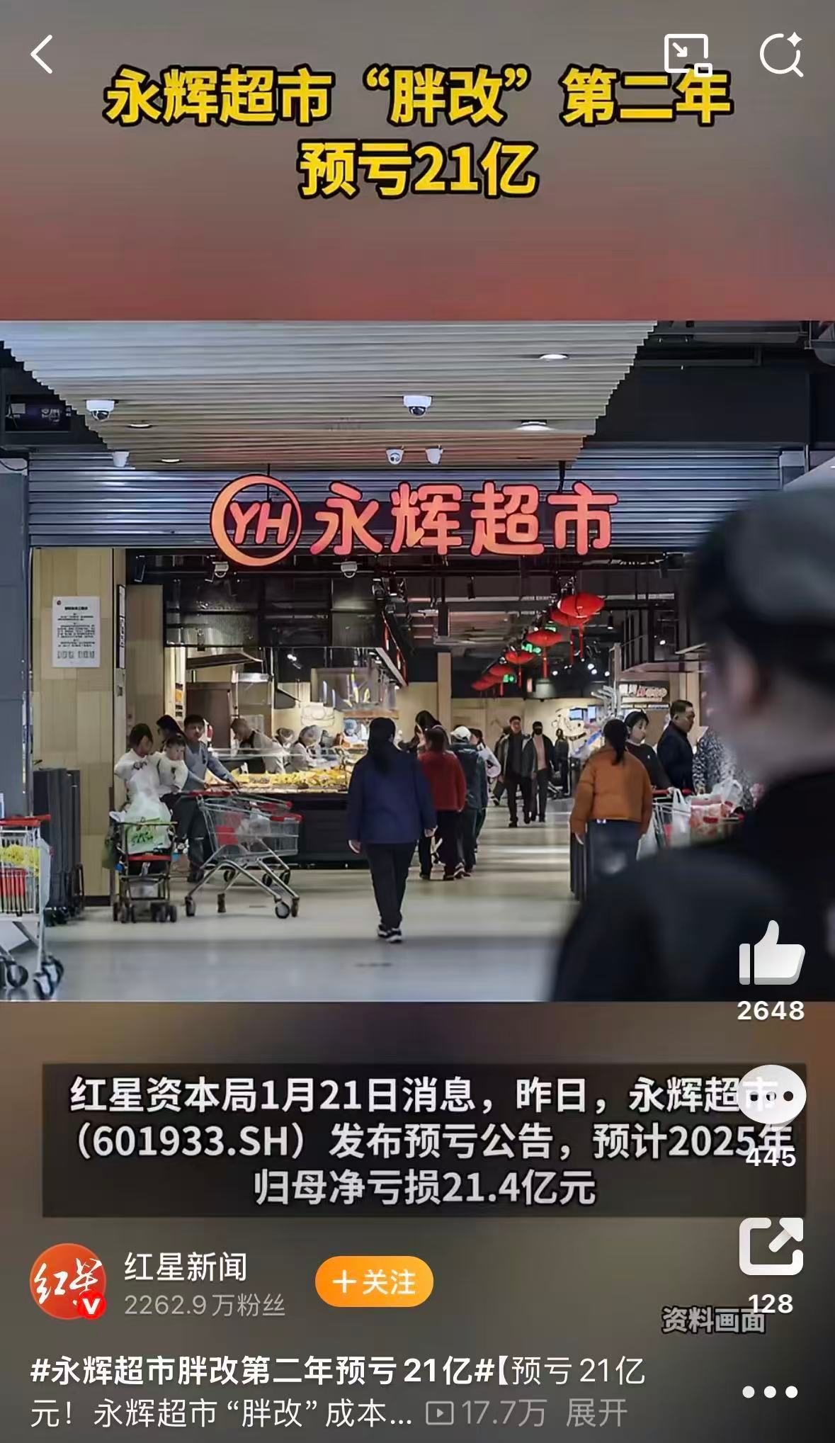 永辉超市胖改第二年预亏21亿没想到永辉胖改还亏这么多,但改完是真的香!品类丰富超多,价格也亲民了点,商超哪是拼服务内卷啊,核心是商品力、供应链和运营效率,找回自己才是破局关键!