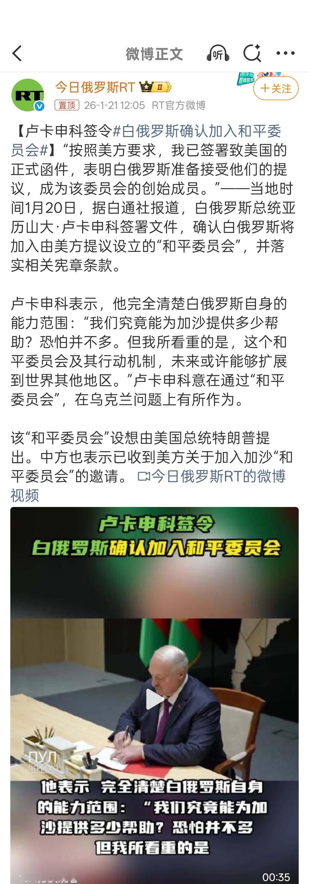 卢卡申科签令,白俄罗斯确认加入和平委员会