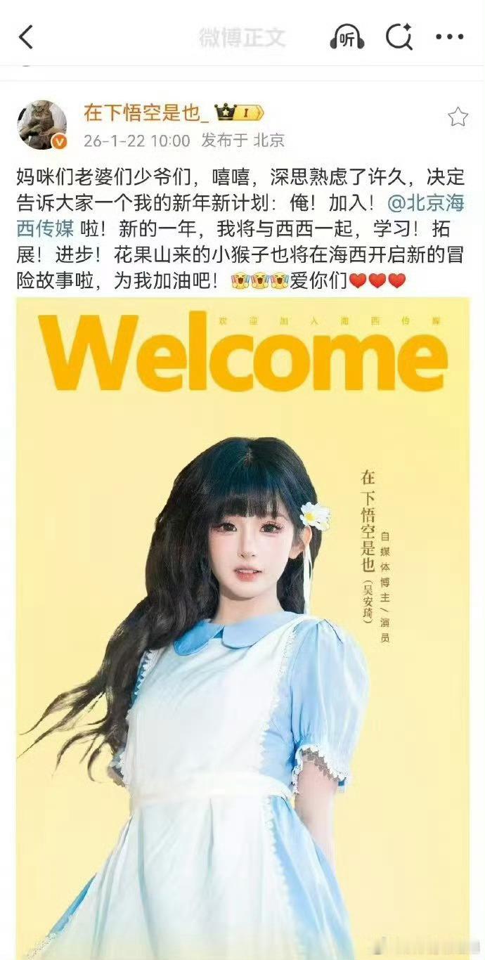 在下悟空是也签约海西传媒一直关注她的创作,能感受到她对表演的热爱。现在正式签约成为演员,算是朝着梦想又迈进了一大步,期待她未来带来更多样的角色。