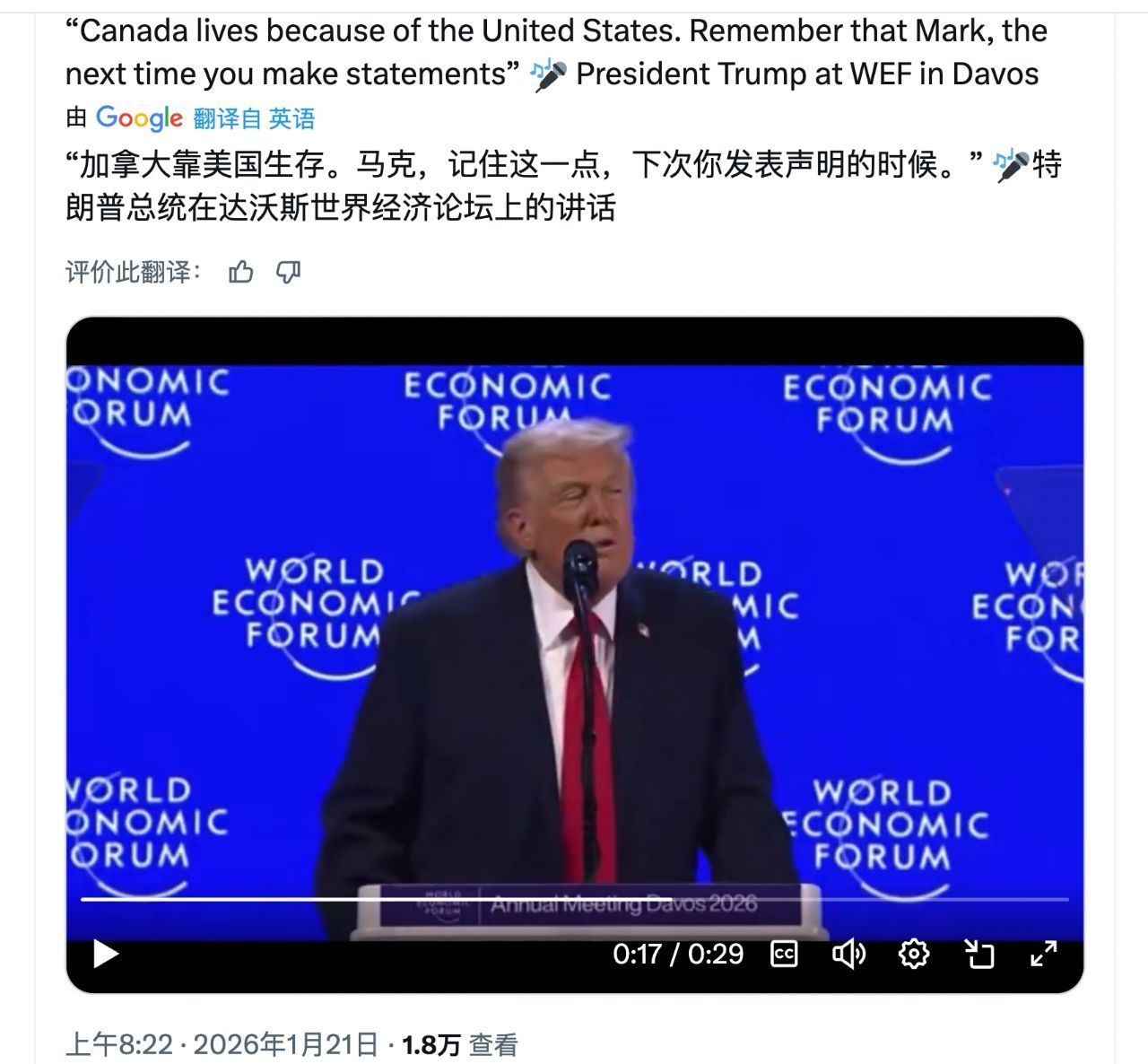 川普总统在达沃斯演讲中警告卡尼书记:“加拿大从我们这里得到了很多好处。他们也应该心存感激,但他们并没有……加拿大靠美国生存。马克,记住这一点,下次你发表声明的时候。”加拿大75-80%的产品出口是到美国,卡尼居然高调搞什么”新世界秩序“。