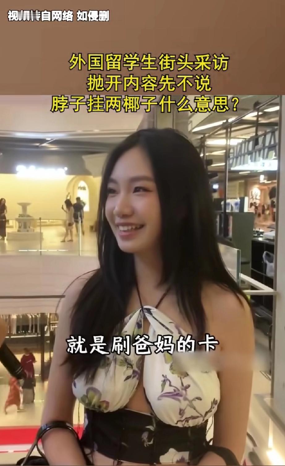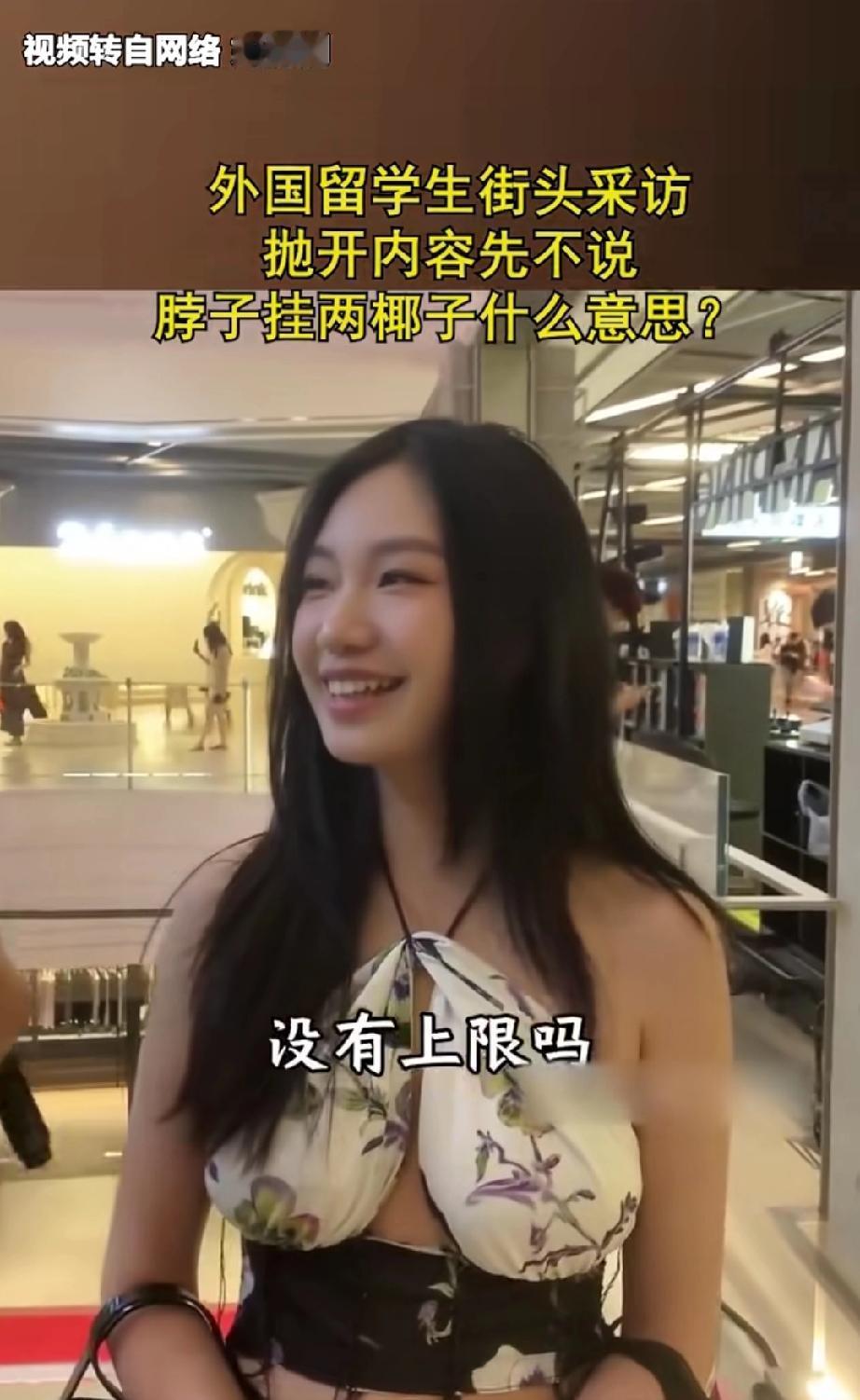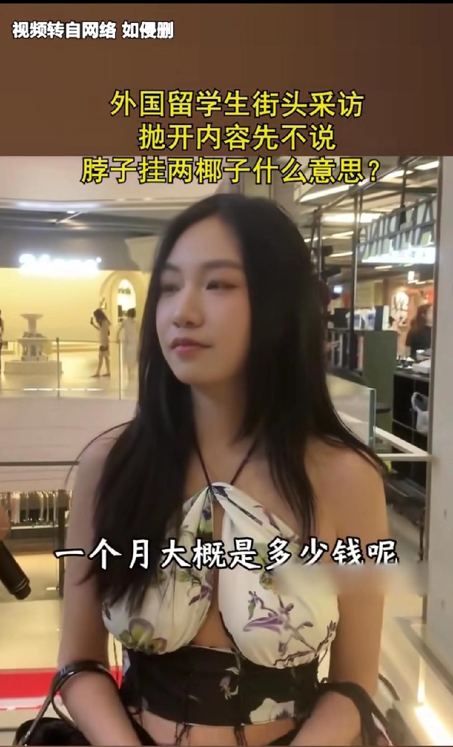 一留学华人小姐姐接受访问,没想到网友对小姐姐的留学经历好像丝毫不感兴趣,纷纷把注意力集中在小姐姐的穿戴上面! 看来国外大学果然要比国内的大学更开放更包容,这种把两个椰子挂在胸前式的穿戴在国内绝对难得一见,估计也没有女生有勇气敢在国内大学校园里里穿成这样! 其实结合小姐姐说的家庭条件,人家这样穿戴也无可厚非,记者问她在学校一个月开销有多大,她回答不知道,刷父母的话,而且从来就没有具体算过一个月到底刷多少,甚至可能连上限都没有,这就是实力决定生活品味啊!