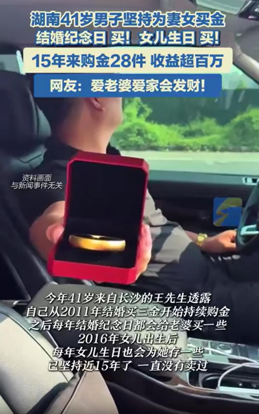 果然爱妻者风生水起!湖南长沙,一名41岁男子每年都会给妻女买金,原本就是为了表达爱意,没想到却有了意外收获,算了一下,15年购买了购金28,收益超过了百万 王先生今年41岁,他表示自己可以说是典型的“爱妻如命”的代表。从2011年结婚那年买“三金”开始,就养成一个习惯:每年结婚纪念日,都给妻子买点金子。2016年女儿出生后,这个习惯又多了一份甜蜜的负担,每年女儿生日,也给她存上一件。金条、金饰,陆陆续续地买,只进不出,就这么攒了快十五年 他自己可能都没仔细算过总账,直到最近在存金软件上看了一眼,才发现这份持续的心意,已经攒下了28件。当初累计投入65万多,而按照现在的金价估算,这些东西的价值已经超过了170万。算下来,浮盈超过百万,收益率接近160% 可能有人会觉得,黄金投资只是一种偶然的幸运,其实不然。王先生的这笔“黄金事业”可不是突如其来的暴富,而是稳扎稳打的长期坚持。他并没有为了赚钱而投资,而是通过这份爱意,逐步积累了财富 每一件金饰背后,都是他对妻子和女儿的深情,而黄金的价值随着时间的推移,不断增值,让他在这段家庭情感的背后,意外收获了财富 在我看来,真挚的情感本身,就是一种极好的“策略”。 当你的出发点是爱和责任,你所做的决定往往会更纯粹,也更可能长期坚持。这种坚持,恰恰是很多事成功的关键,无论是经营家庭,还是打理生活