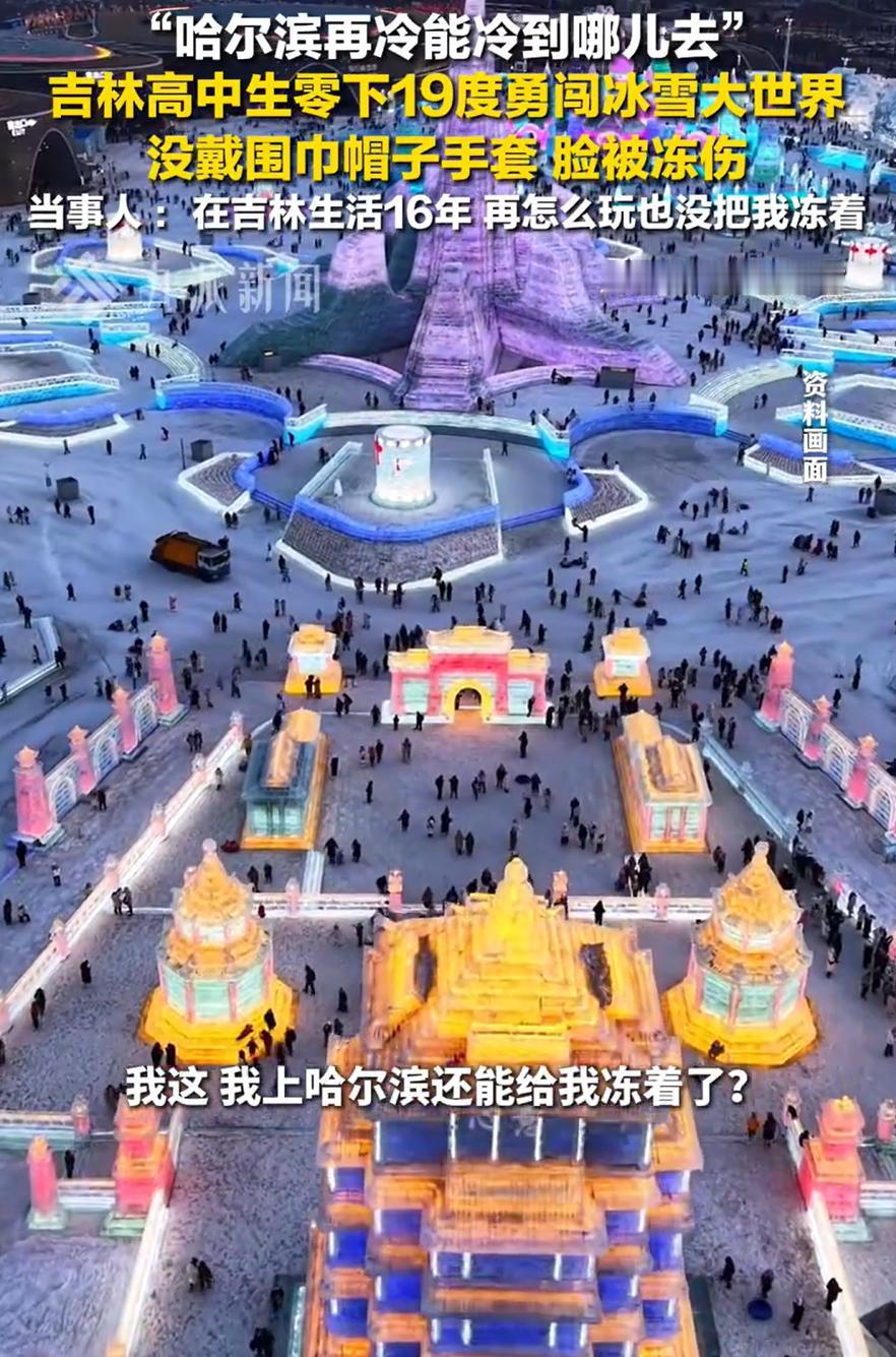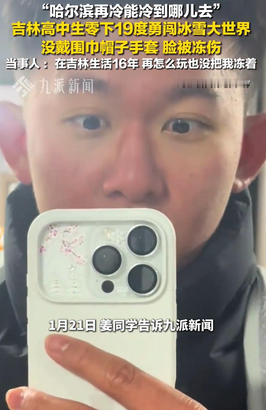 万万没想到!一名吉林的高中生到冰雪大世界游玩,想着都是在东北,再冷还能冷哪去,结果从早上9点玩到晚上7点,自己却被冻伤了,连眼眶都被冻青了,这才意识到是高估了自己。网友:原来东北和东北还不都一样 小伙是吉林人,在出发前,他特意看了当天的天气预报,看到只有19度,还觉得不算冷,只要穿好羽绒服和保暖裤就可以了,甚至连手套、帽子、围脖这些保暖装备都放在了家里 没成想,因为景区里到处都是冰和人造雪,虽然天气是零下19度,但在景区里体感温度却能达到零下25摄氏度,手刚从兜里拿出来就快失去知觉了,小伙虽然玩了整整一天,可几乎半小时就要进屋取暖,离开时更是脸都被冻上 小伙称,自己在吉林生活了16年,出发前想着哈尔滨再冷还能冷哪去,在吉林都没冻到过,难不成去趟哈尔滨就被冻到了。结果玩了一天下来就被“教育”了 其实仔细想想,这不是说两地的气温真有天壤之别。哈尔滨和吉林同属东北,冬天都冷,但冷和冷之间,还真不一样 冰雪大世界这种地方,冰雕雪塑集中,风力有时更明显,人在户外长时间活动,体感温度往往比市区更低。加上游玩时经常走动、出汗,再一停下来,湿气遇冷,更容易失温。这小伙子虽然习惯了东北的冷,但低估了特殊环境下的寒冷效应 类似的情况其实不少见。很多人觉得自己从小在北方长大,抗冻,去北方其他地方玩就不用太防备。但寒冷这件事,真不能全凭经验。城市和景区不一样,有风和无风不一样,干冷和湿冷也不一样 由此可见,出门在外,多一分准备没坏处。手套、帽子、围巾,看着是小东西,关键时刻能保暖。觉得可能用不上,也最好带上,宁可多背一点,也别高估自己的耐寒能力