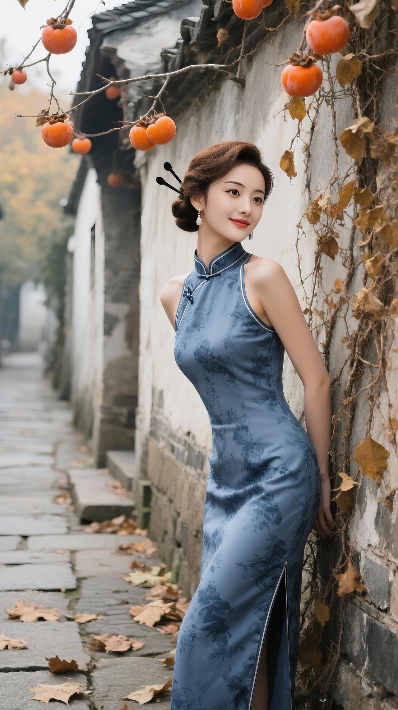 秋日古巷,旗袍美人,韵味十足。旗袍美人倚墙,岁月静好。