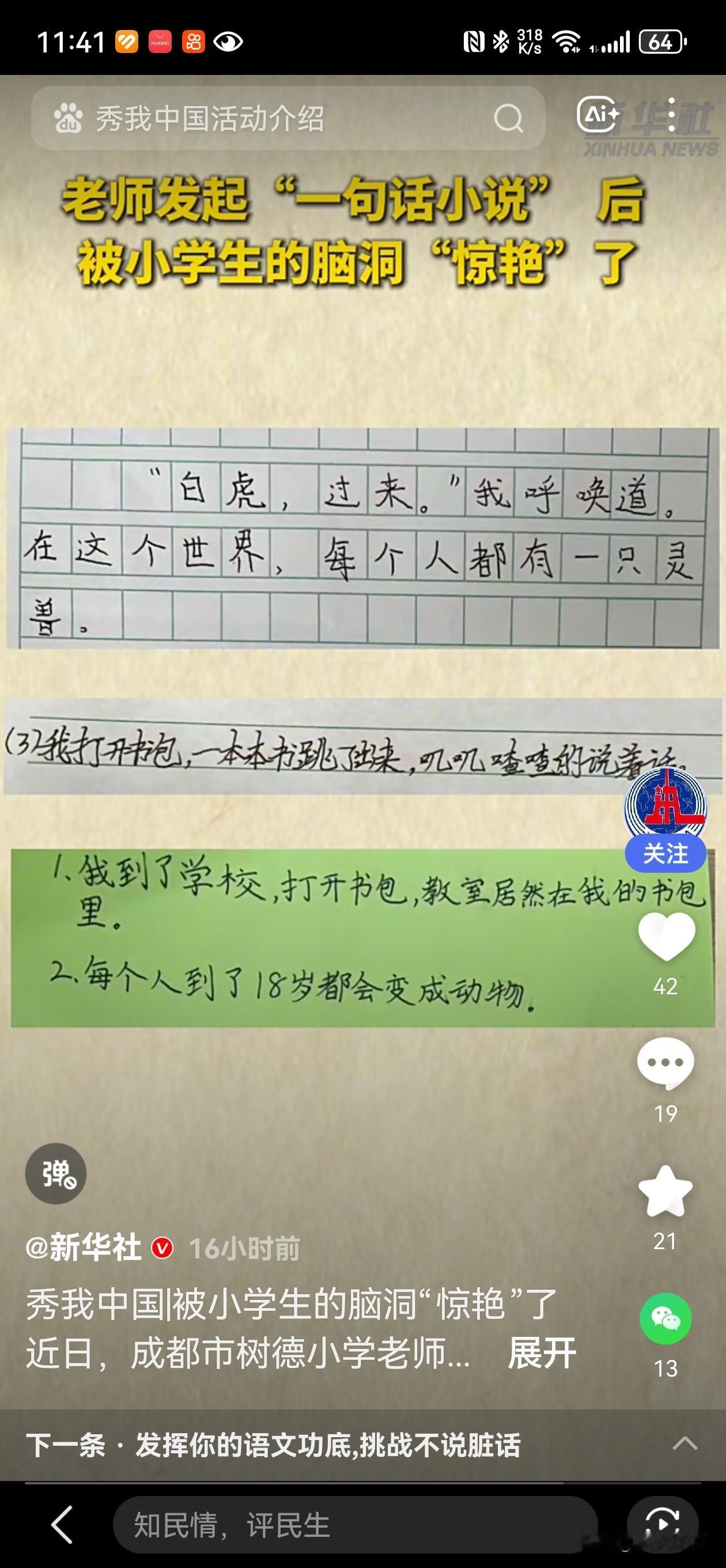 近日,成都一位小学老师发起了“一句话小说”的创作活动,受到了广大师生的热烈响应。 学生们纷纷踊跃参与,提交了大量趣味十足、创意十足的作品,场面十分热闹。老师惊喜地发现,孩子们的文字表达充满想象力,脑洞大开,令人叹为观止。 这些“句子小说”不仅简短,却能展现出丰富的故事情节和奇思妙想。 有人写“我用魔法棒变出了一个会说话的苹果”,有人描述“在遥远的星球上,一只会跳舞的机器人寻找朋友”。孩子们用天马行空的想象,创造出了一个个令人惊喜的世界,让人感受到他们纯粹的创造力和无限的潜能。 这次活动不仅激发了学生们的写作兴趣,也让老师看到了孩子们丰富的想象力和表达能力。 相信这样的创意写作方式,能帮助孩子们更好地释放天性,培养他们的创造力和表达能力。 你觉得一句话也能讲出精彩的故事吗?你有哪些有趣的“句子小说”想分享?欢迎留言,一起感受孩子们的奇思妙想!
