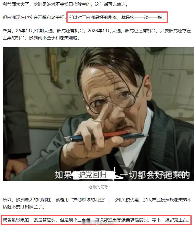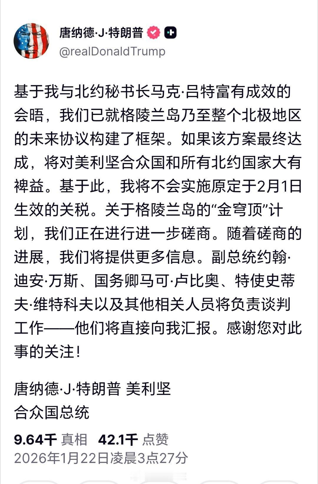 特朗普称与北约达成格陵兰合作框架烽火问鼎计划特朗普暂不对欧洲8国加税 笑死,昨天长文才说了,欧洲对美国最美剧本,就是拖着谈。反正口头绝不承认格陵兰主权割让,但可以在别的利益上让步把老川子拉到谈判的框架下,然后就能今日进三步,明日退四步,后天进五步……如此反复的谈,拖到11月,有信心振奋一下,再拖到28年11月……结果,果不其然,老川子去了一趟欧洲,欧洲国家搭了个框架和老美谈,意思就是格陵兰可以聊其他的权益,但主权这事咱们先留给后人去解决。然后,老川子就取消了八国关税了。老川子这么喜欢嘚瑟喜欢“赢”的人,针对于欧美就格陵兰谈判框架的表态,都没有吹一下格陵兰主权归老美,可见欧洲是真的没有在主权问题上松口。仅仅是在其他方向给了些利益让步,然后谈而已。什么让步?“金穹顶计划”,就是老川子的那个防空导弹体系,也就是说,欧洲用老川子在格陵兰增兵这么个事,换了老川子对格陵兰主权的暂时住口。不过,从实质上说,在格陵兰驻金穹目标是针对老俄。但是一个金穹防空单位,估计格陵兰当地的美军驻军人数又得涨了。也只有这样的事,能让老川子答应暂时停下咬下去的牙口。格陵兰闹剧搞完,现在进入下一题——空袭伊朗!