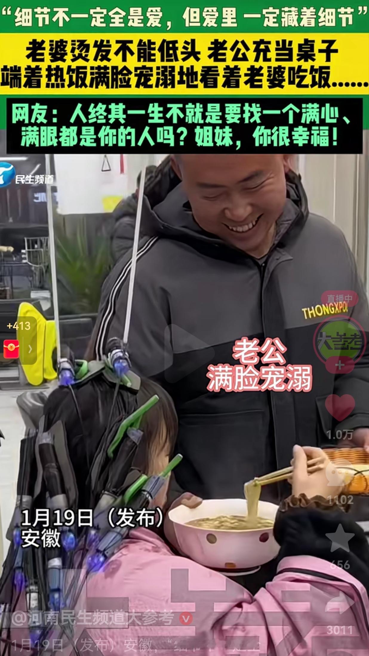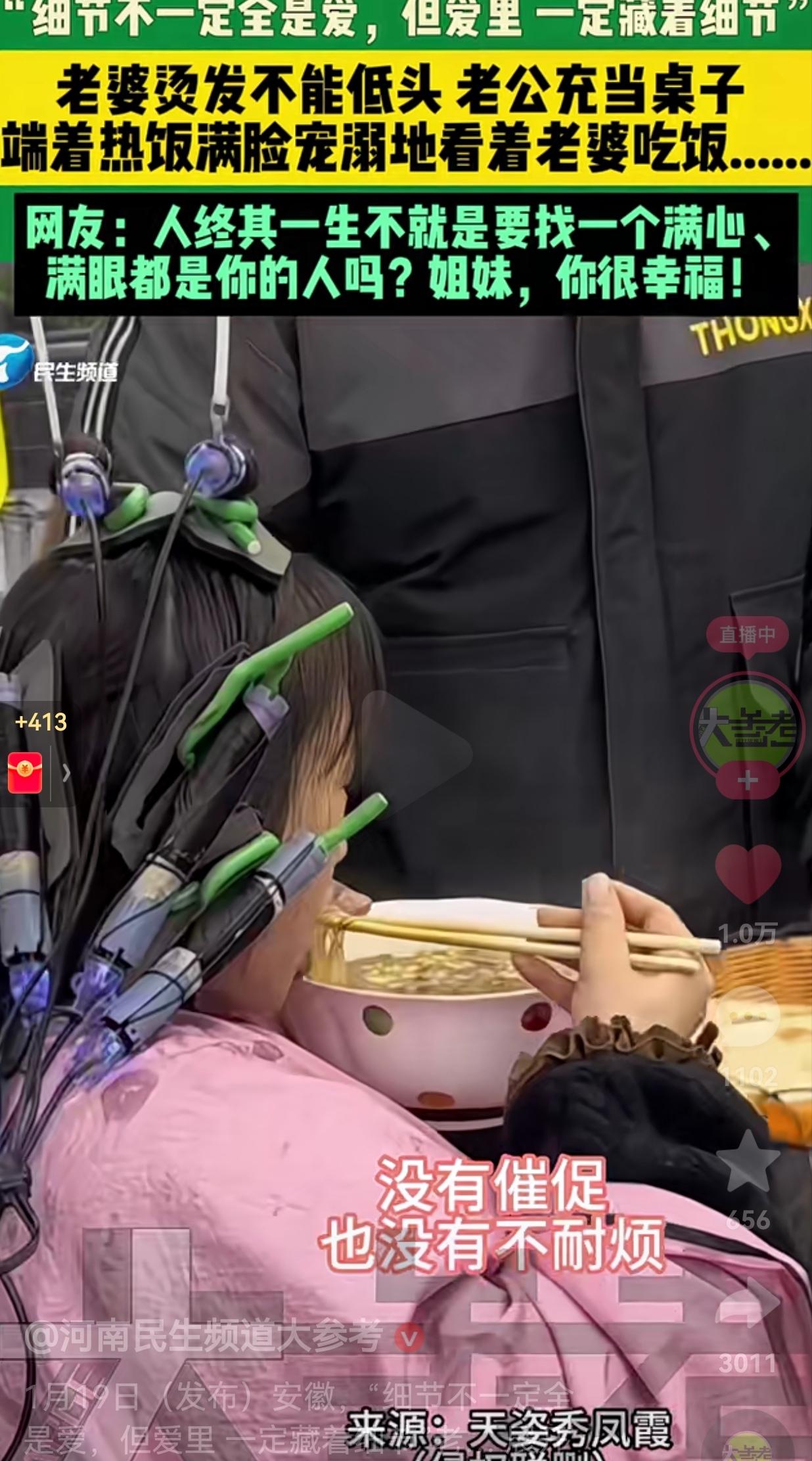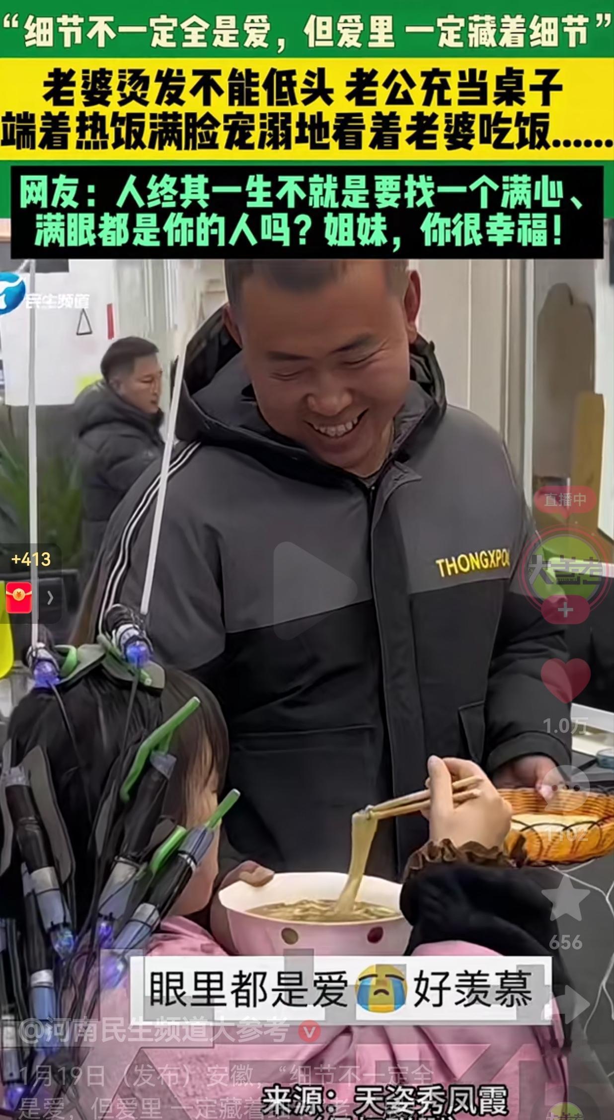 太甜了!看得出来这男人真的很爱自己的女人!1月19日,安徽一位女士正在理发店烫头,头发上卷满了发卷,根本没法低头。 可是,已经到了饭点,她的老公看到妻子没吃饭后,什么也没说,直接买了一碗热气腾腾的热饭,为了让妻子吃得舒服,他就这么一直端着碗,当起了“人肉桌子”。 令人感动的是,从他的脸上可以看到憨憨的笑容,满眼宠溺地看着老婆吃饭,没有催促,也没有不耐烦,直到妻子把饭吃完。   这一段视频发到了网上,网友们看完后,纷纷都酸了,有的网友说: “细节不一定全是爱,但爱里一定藏着细节。” 也有的网友说:“人这一辈子,不就是要找一个满心满眼都是你的人吗?这女人有福气,她找到了满眼都是她的男人。” 还有的网友说:“看他老公憨憨的样子,她肯定嫁对了人!” 其实,好的爱情,不是婚礼上的誓言,而是在你不方便,需要另一半的时候,他就成为你最真实的依靠。你需要我的时候,我就稳稳地站在你身边。 这种没有刻意的浪漫,只有下意识的心疼和观音,这大概就是普通人最羡慕的幸福吧。 话说,你的另一半,有没有做过让你暖心的事情呢?如果有的话又是什么呢?