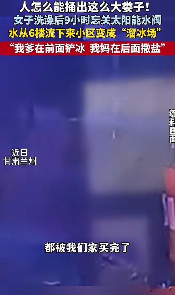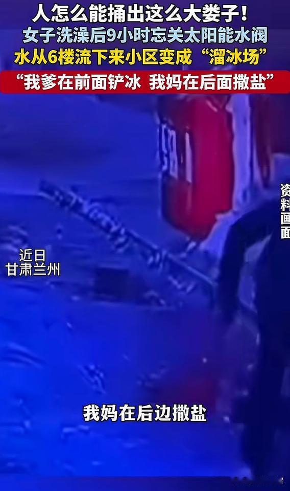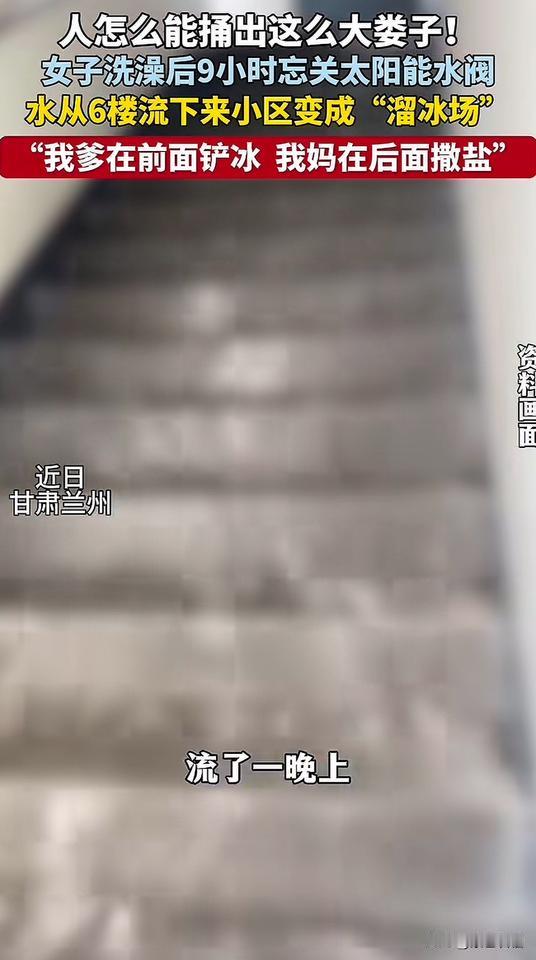 笑喷了!继呆呆之后,2026年第二个闯下大祸的女子出现了。 甘肃兰州的一位女子在社交平台向全小区业主致歉,只因她闯了大祸,先是致使小区停水,后又让小区用户断了盐。 原来,女子晚上洗澡时开启太阳能烧水,之后却忘了关水,水白白流了一整晚。第二天起床,小区竟成了一个滑冰场。 为弥补过错,女子的爸爸凌晨五点就起来铲冰,妈妈则负责在后面撒盐。为尽快铲完小区的冰,女孩把全小区的盐都给买光了,她怕大家买不到盐,再一次郑重致歉。 看完我笑得前仰后合,虽说道歉十分诚恳,但这祸闯得着实不小。我都能想象他们一家奋力铲冰的模样。 对于该女子闯祸一事,大家有何看法?欢迎在评论区交流。 (图片来源网络)