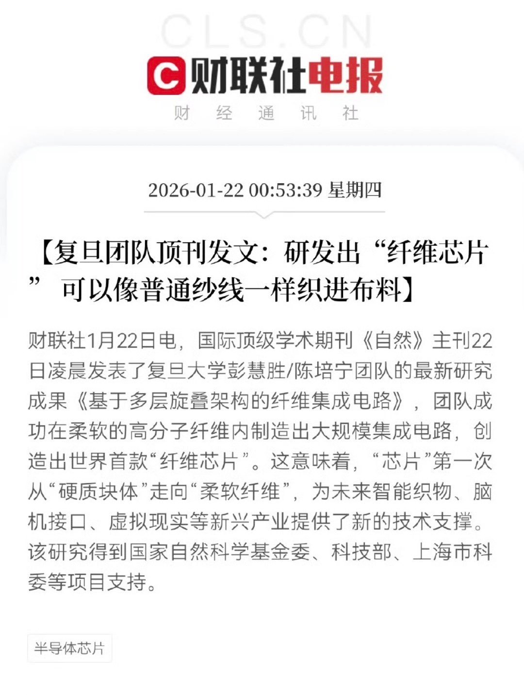 复旦大学研发出世界首款纤维芯片未来衣服能直接播视频、手套精准模拟触感,发丝细的纤维还能探测处理脑电信号?1 月 22 日,复旦彭慧胜、陈培宁团队突破传统硅基芯片范式,造出 “纤维芯片”,一根弹性高分子纤维里集成供电、传感、显示、信号处理等多功能,科幻照进现实了!