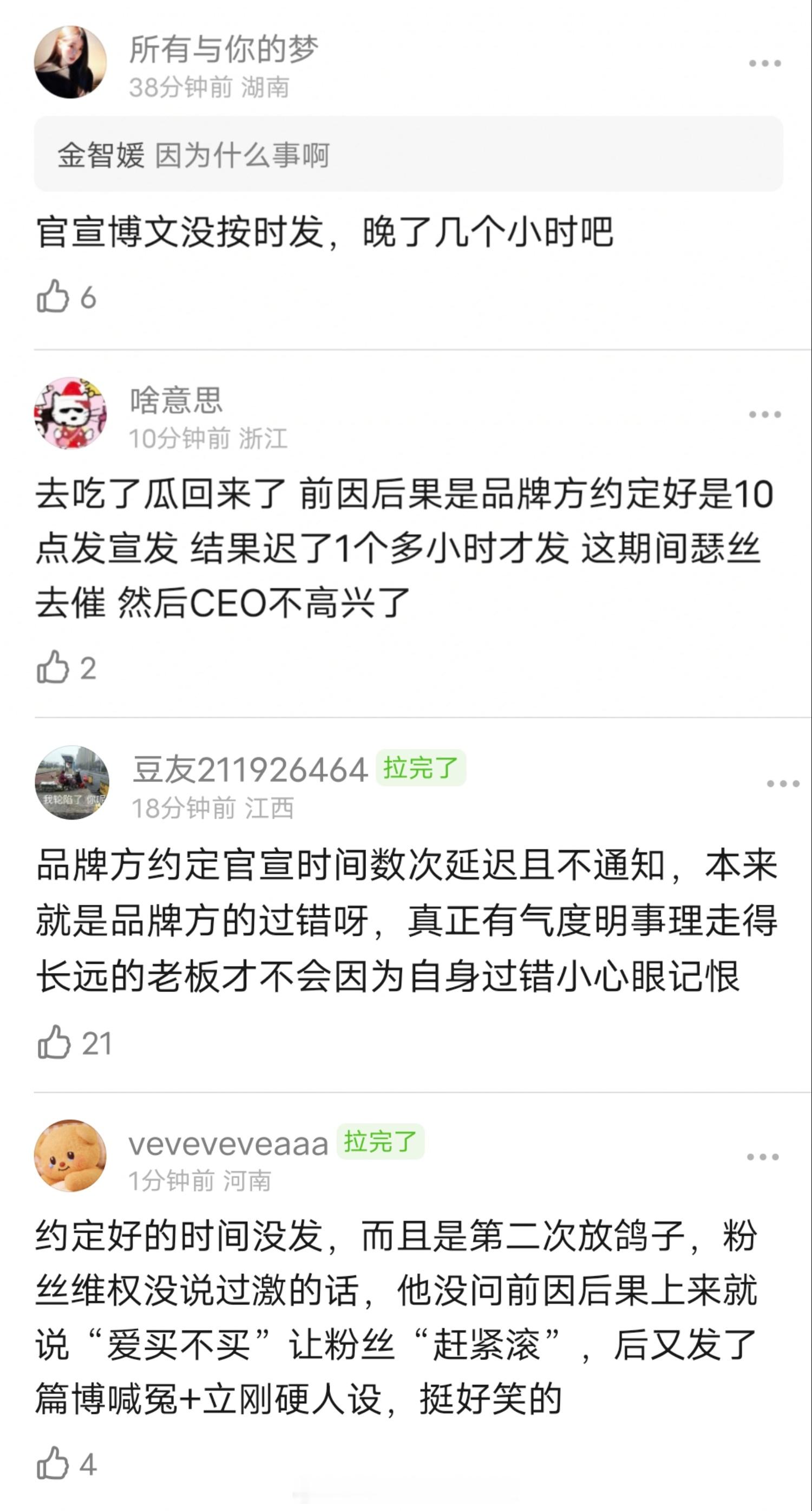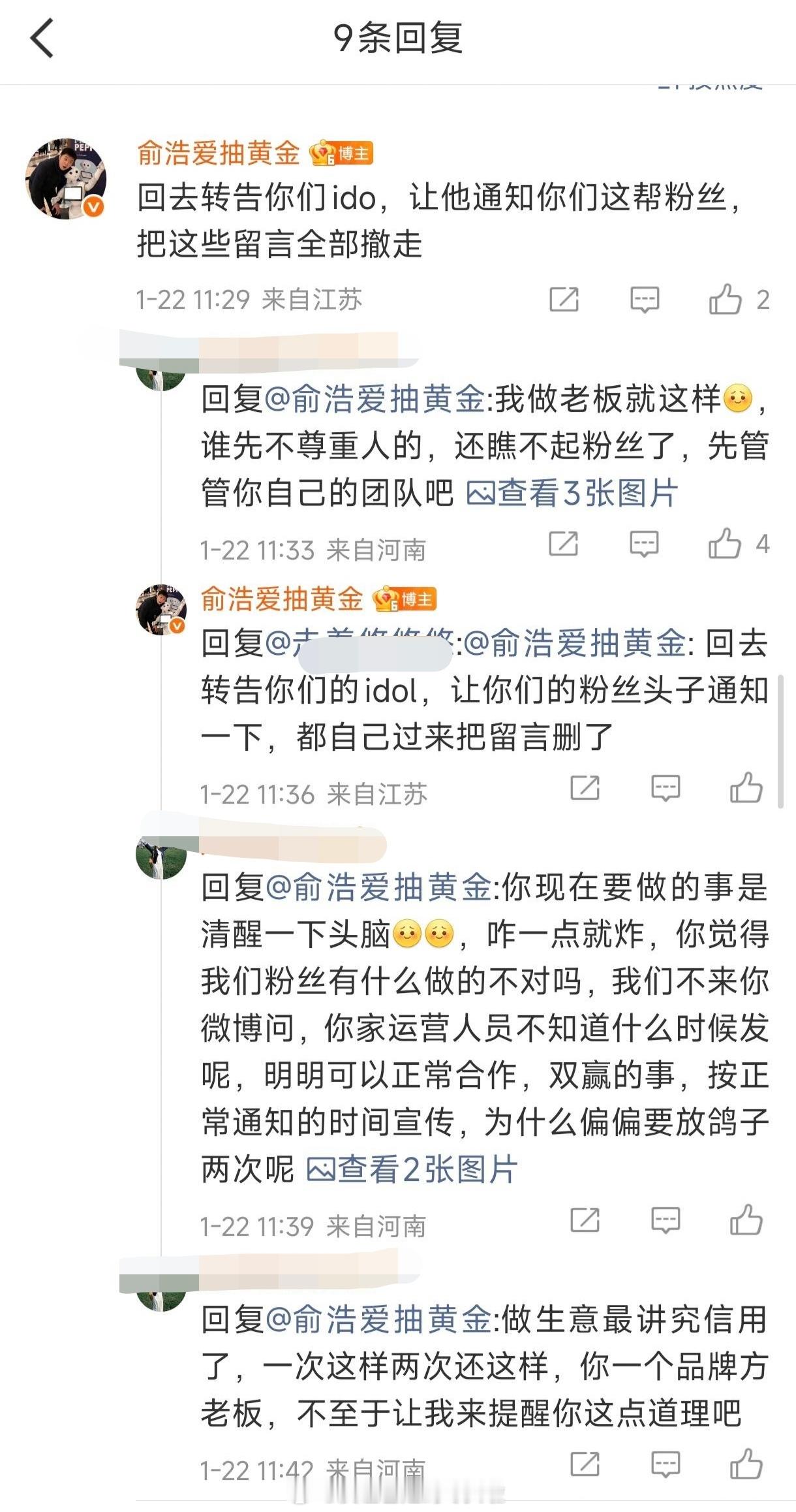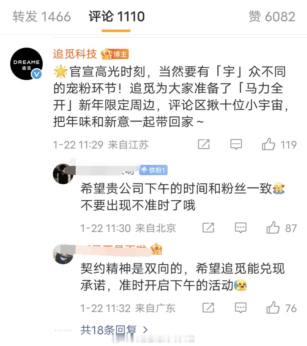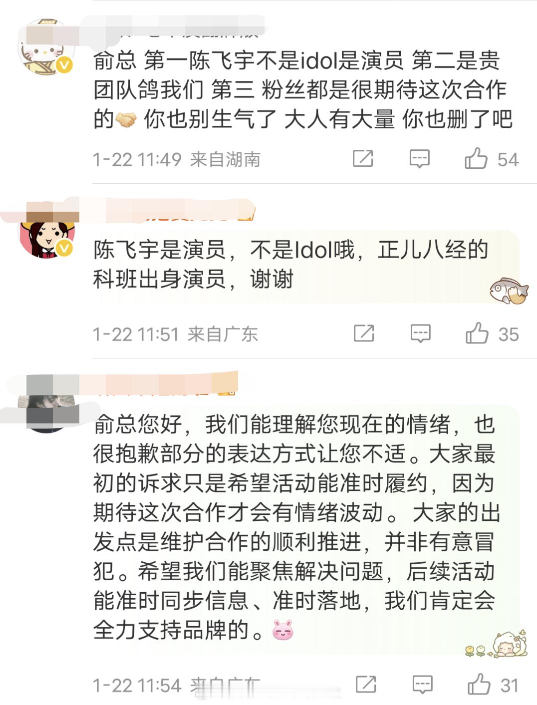 追觅CEO怒怼陈飞宇粉丝:陈飞宇也没来找我说,团队也没来找我说过有啥事,一群粉丝就排队到别人下面刷屏。回去转告你们idol,让他通知你们这帮粉丝,把留言都删了。起因是陈飞宇今天官宣追觅新代言,品牌方约定官宣时间数次延迟且不通知,说好上午10点官宣,结果无缘无故推迟了1个多小时才发。