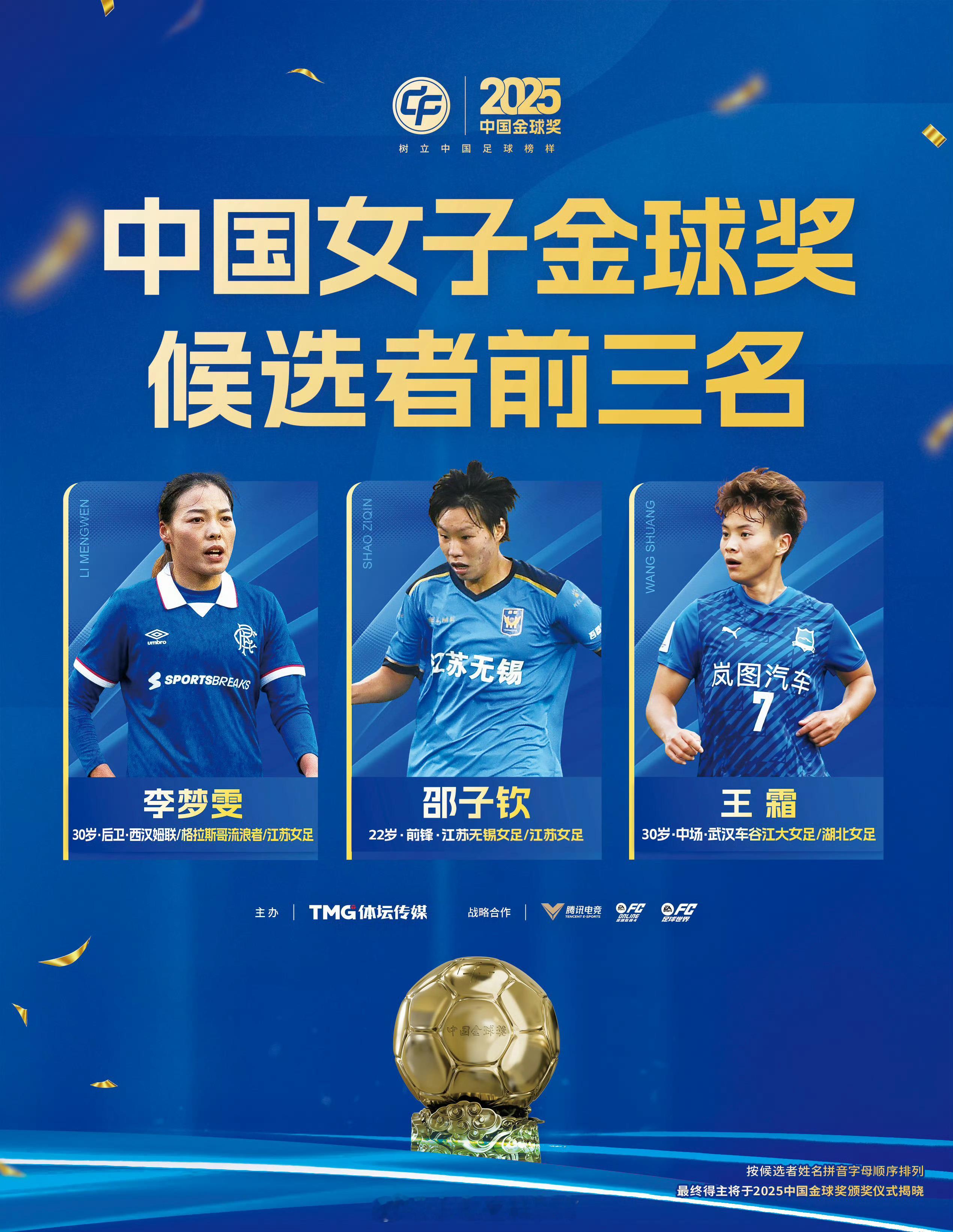 2025中国金球奖候选前三公布武汉车谷江大女足球员王霜入围中国女子金球奖候选者前三名,门将陈晨入围中国金手套奖候选者前三名,主教练常卫魏入围中国金帅候选者前三名。2025年,武汉车谷江大女足勇夺首届女足亚冠冠军,并代表湖北女足夺得第十五届全运会女足亚军。三人极有可能获奖中国金球奖武汉车谷江大女足武汉足球
