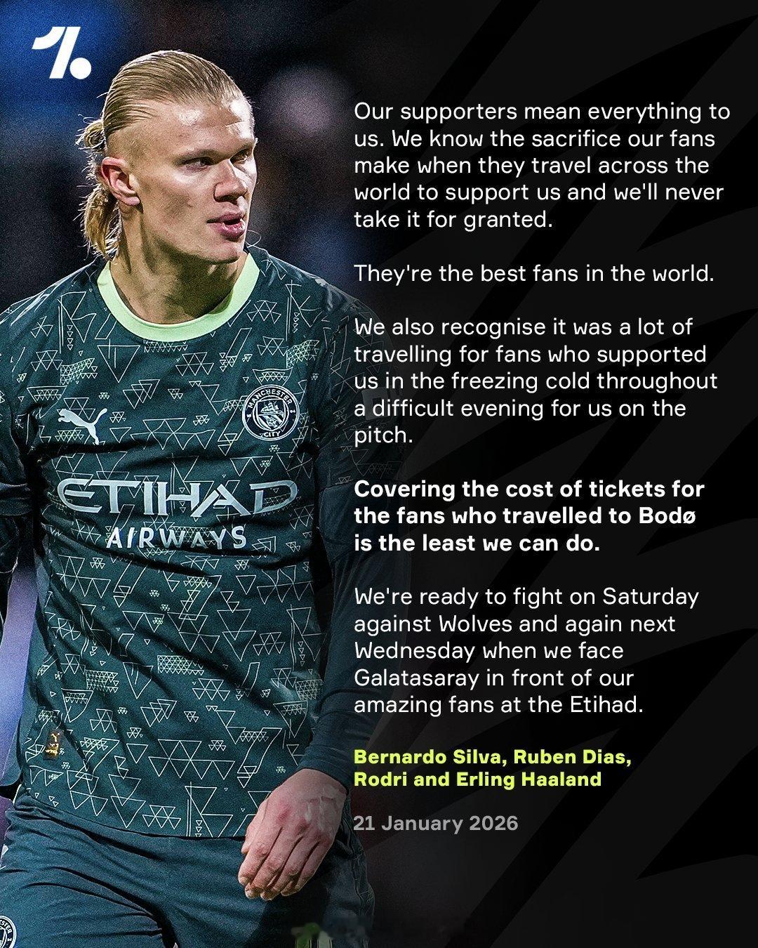 【输球怪我!曼城球员为球迷报销球票】博德闪耀3比1曼城,球队的表现让人失望,曼城球员领导小组决定,内部集资1万英镑,为374名前往北极圈客场支持球队的曼城球迷,报销这场比赛的门票费用,以感谢球迷的坚定支持。欧冠